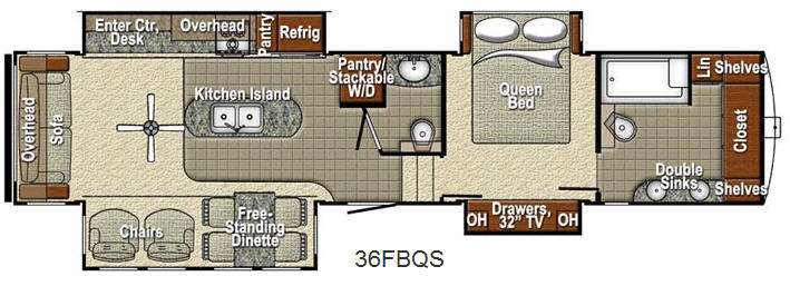 Step into this Canyon Trail Advanced Profile fifth wheel model 36FBQS and be totally amazed at how much like home it feels. With quad slides, one and a half baths, a kitchen island and more, it is hard to believe that you are not home.