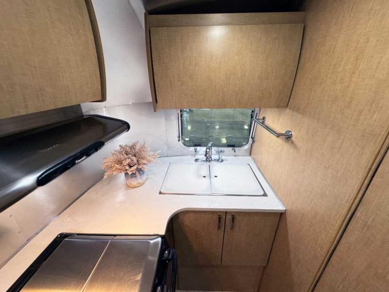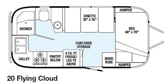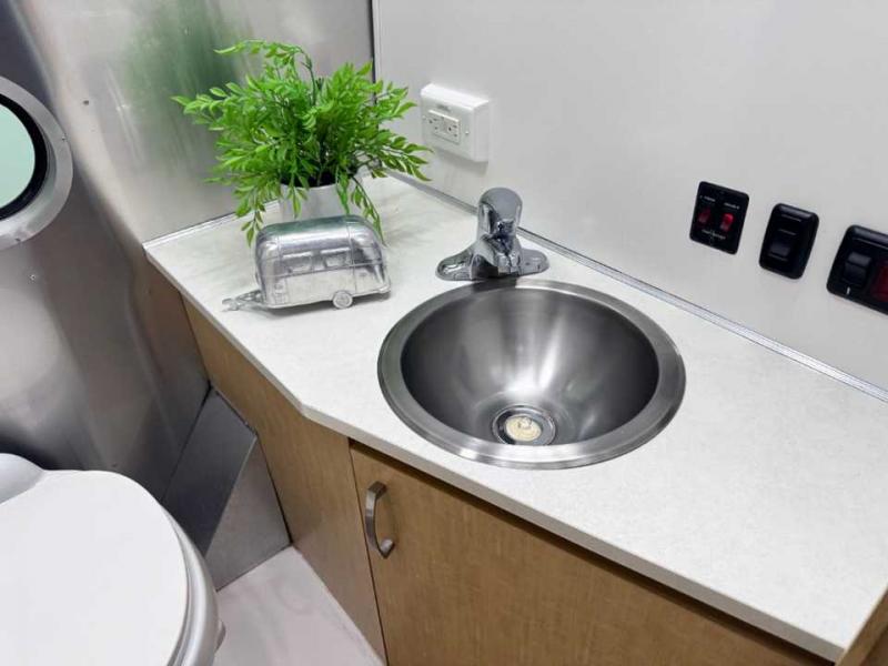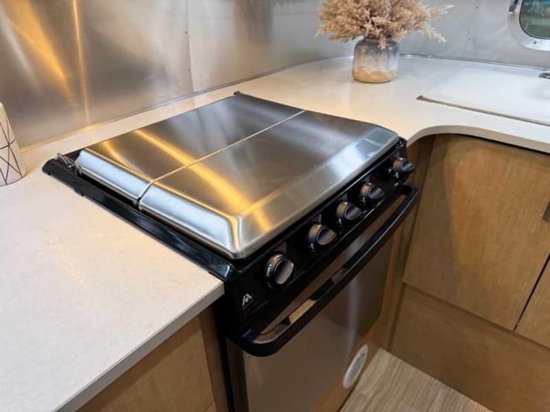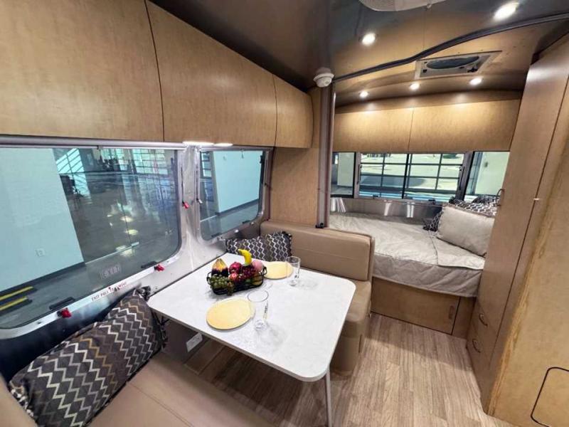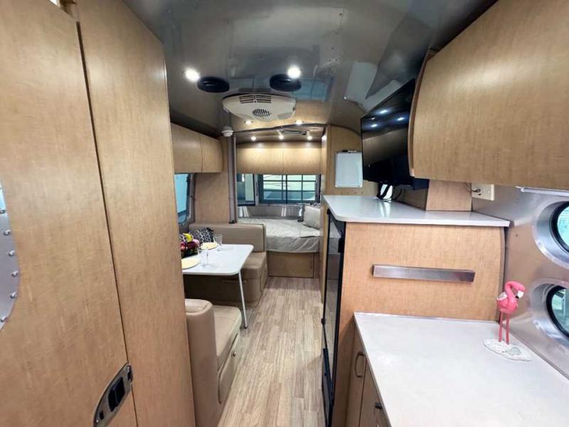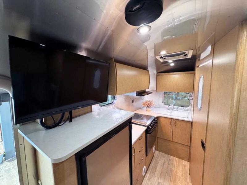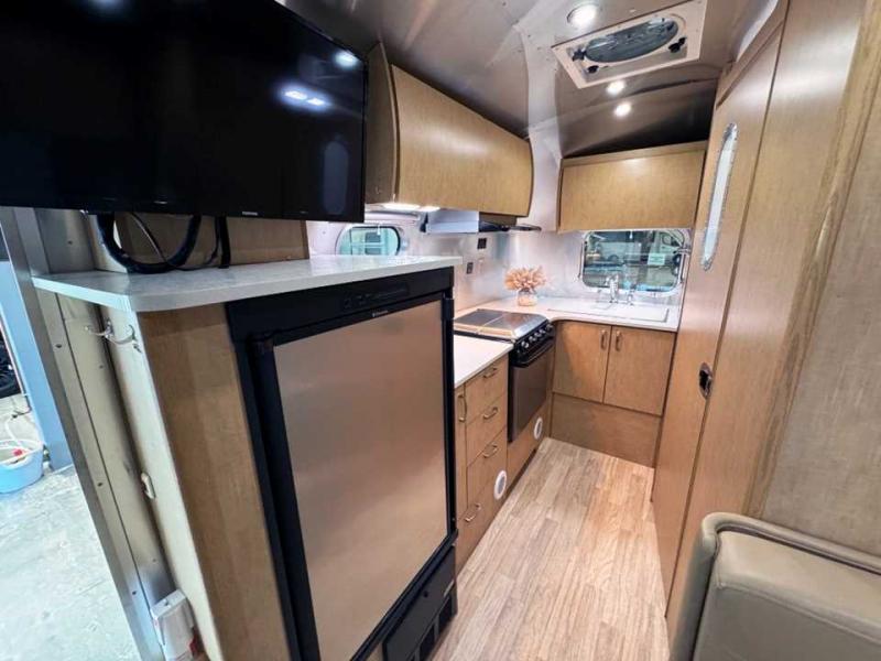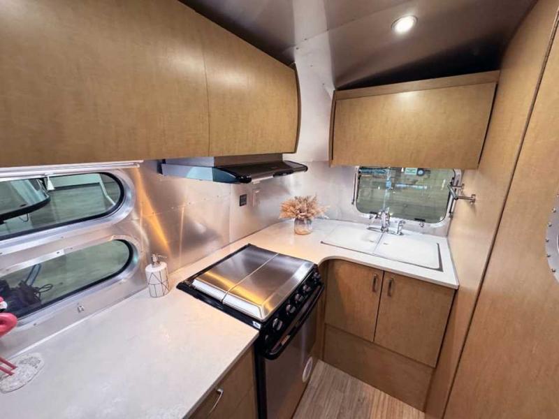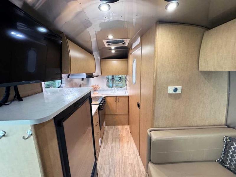 The Flying Cloud 20 travel trailer by Airstream offers a rear corner kitchen area.