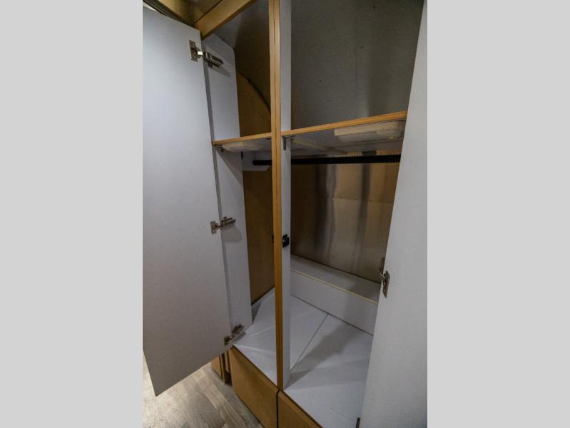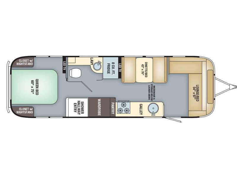 The Flying Cloud 30FB travel trailer by Airstream offers a rear bath layout, plus front and rear sleeping space with a queen bedroom up front and a rear double bed with single bunk above. This unit sleeps 7.