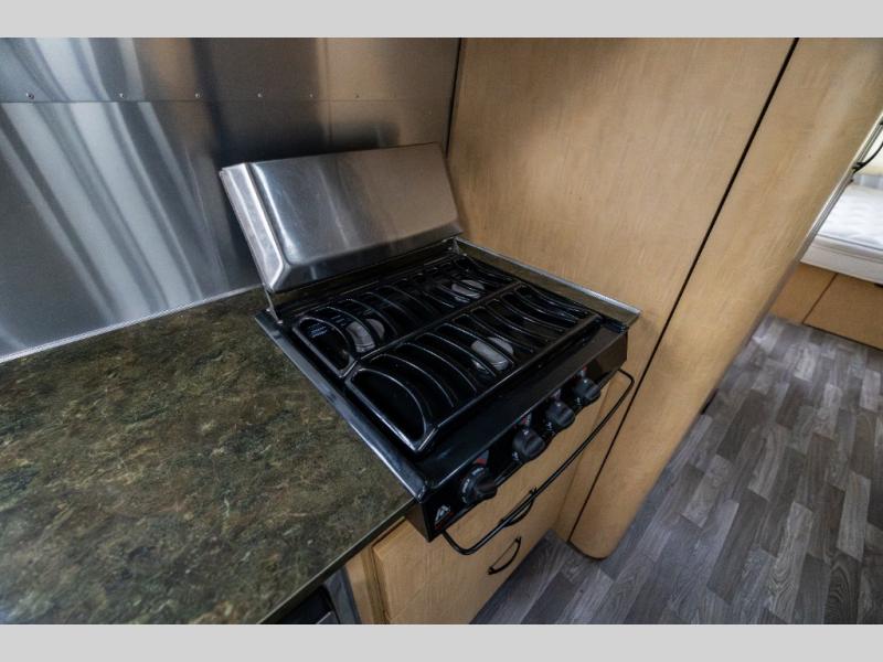 The kitchen features a round sink, and three burner range plus pantry along the road side wall. The opposite side offers a refrigerator for your perishables.
