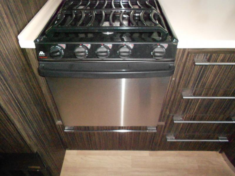 The galley has a sink, three burner range, and pantry on one side of the travel trailer and a refrigerator on the opposite side.