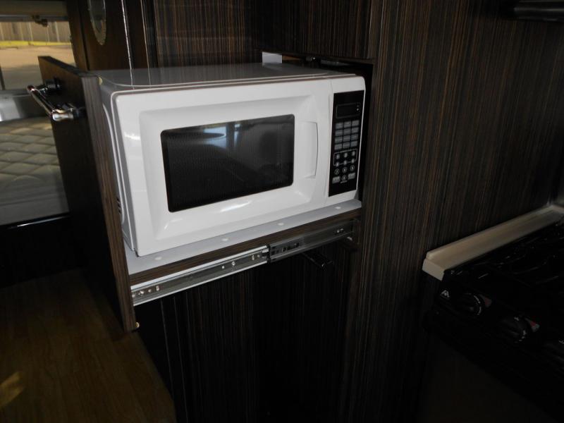 Upon entering the travel trailer, you will notice along the rear wall that there is a dinette. Next to the dinette there is a sofa with a LED TV above the sofa.
