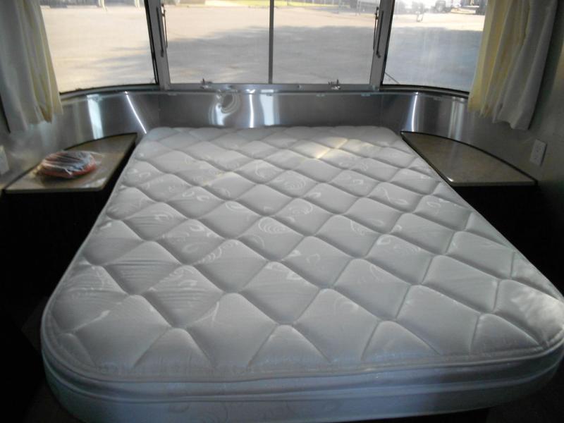 The International Signature 27FB travel trailer by Airstream offers a front bedroom with a 60" x 75" bed and nightstands on either side of the bed, and an optional LED TV along the wall.