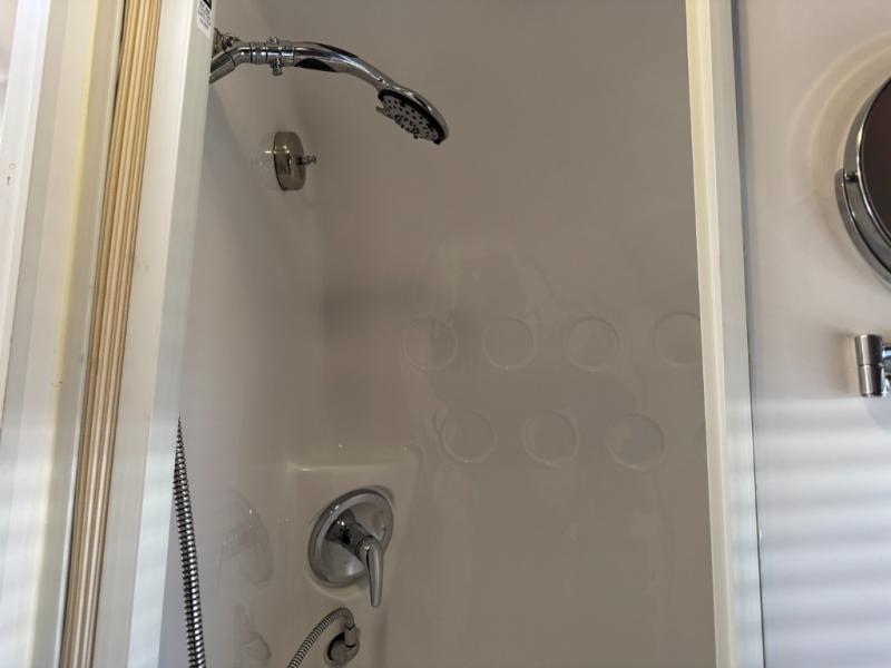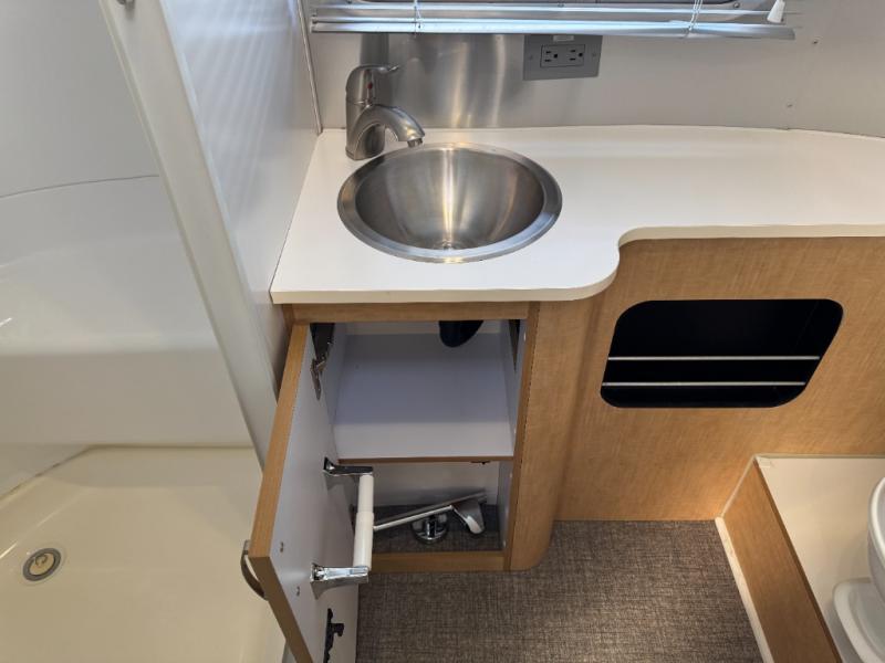 As you enter the travel trailer, in the rear you will find the bathroom with a shower, sink, and toilet.