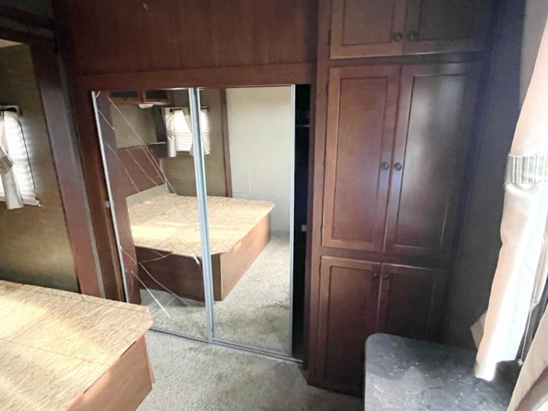 The front private bedroom includes a queen bed slide and overhead cabinets above the bed. There is a large closet, a second corner closet with washer/dryer prep and a chest of drawers as well as a private entry/exit door.