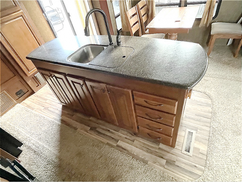 Step through the sliding patio door to a beautiful open kitchen with a pantry, counter and overhead cabinets along an interior wall. A slide out has a refrigerator, four burner range, lots of counter space and overhead cabinets. There are also two recliners in the slide. A large kitchen island holds a double sink.