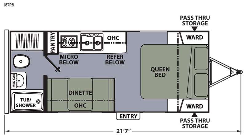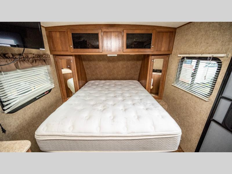 Step inside model 187RB and see a bedroom area to your right with a queen bed and bedside wardrobes, plus an overhead cabinet for additional storage needs.