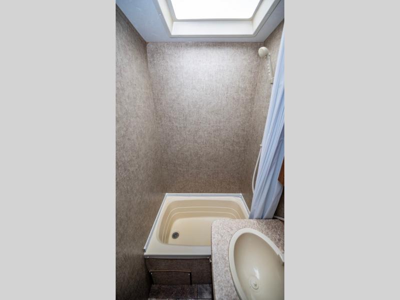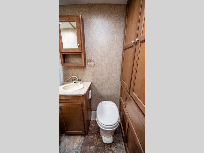The rear of this unit offers a full bath with tub/shower, toilet, vanity with sink plus medicine cabinet, and road side wardrobe for clothing.