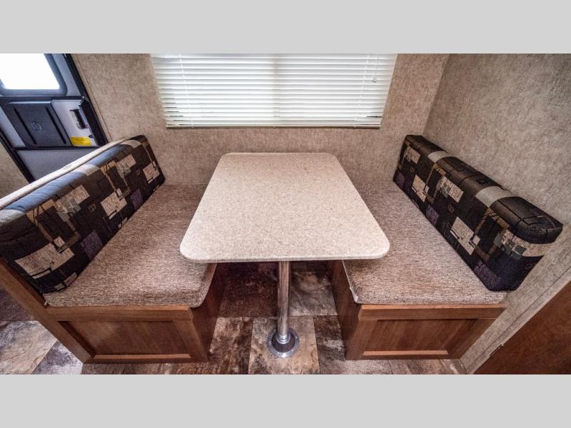 To the left of the entry door there is a booth dinette which is perfect for dining and can also be quickly made into additional sleeping when needed at night.