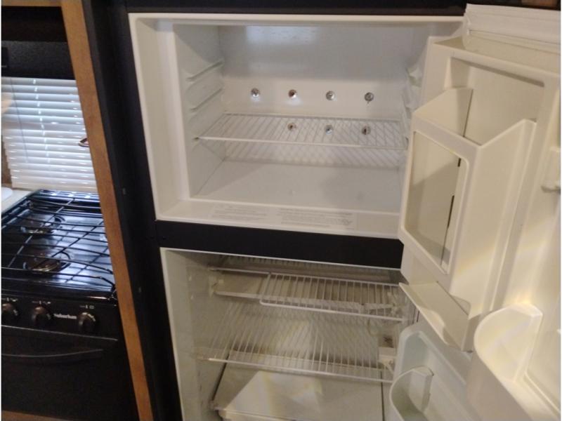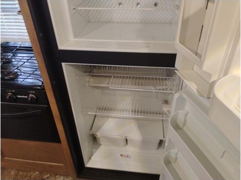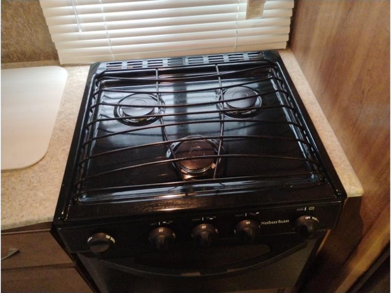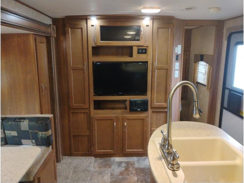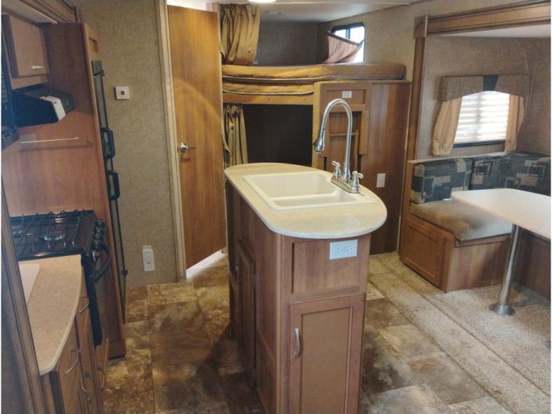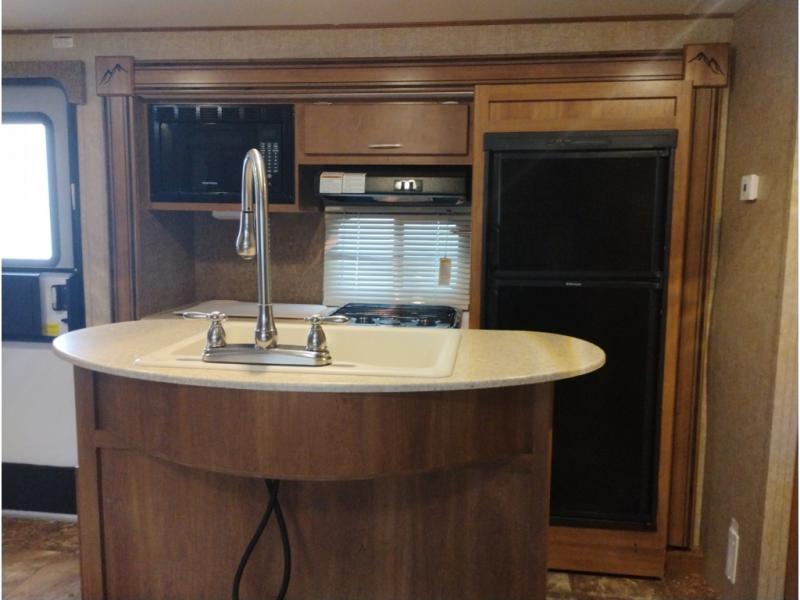 On the opposite side of the trailer there is a second slide featuring a three burner range, microwave, and refrigerator. The kitchen island provides added counter space and a double kitchen sink making cleanup a cinch.