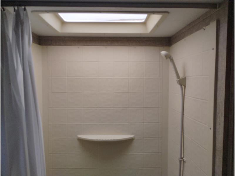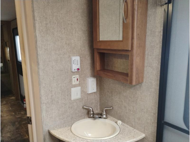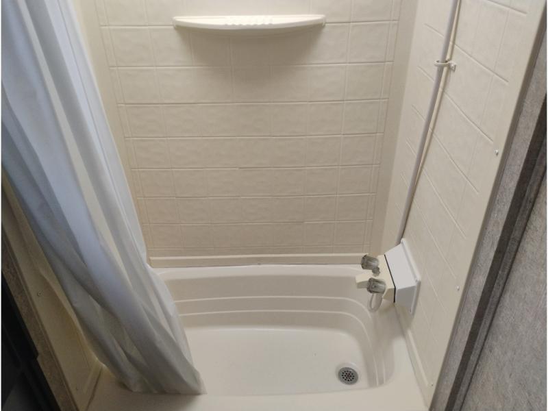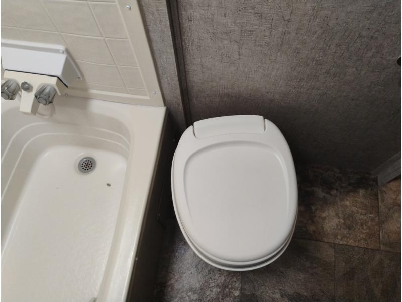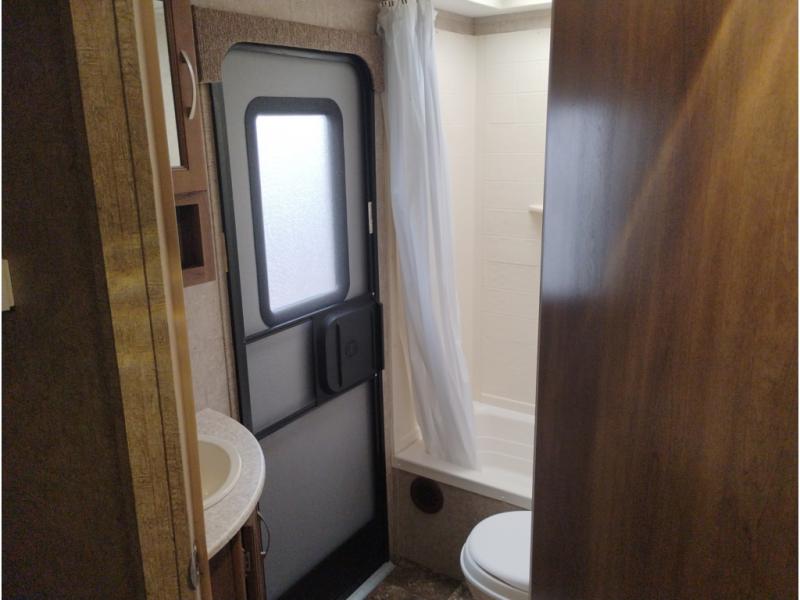 On the opposite side you will find a convenient bathroom with toilet, sink, tub/shower, and private entry. The separate entry makes it easy to access from outside the trailer when enjoying the outdoors.