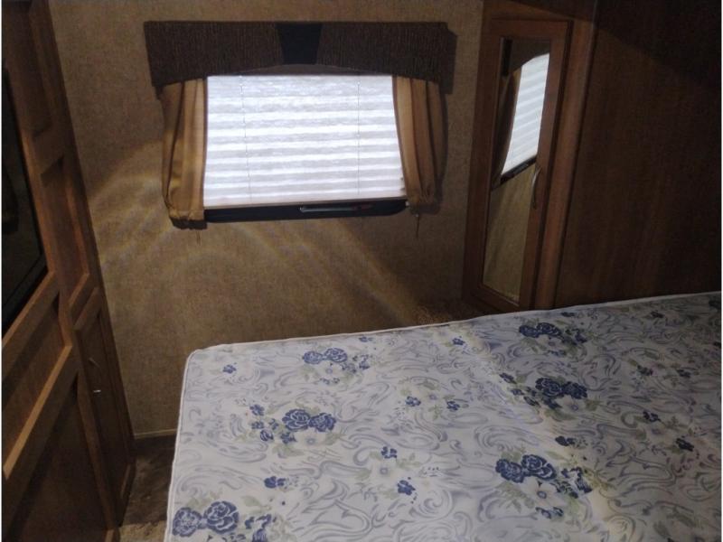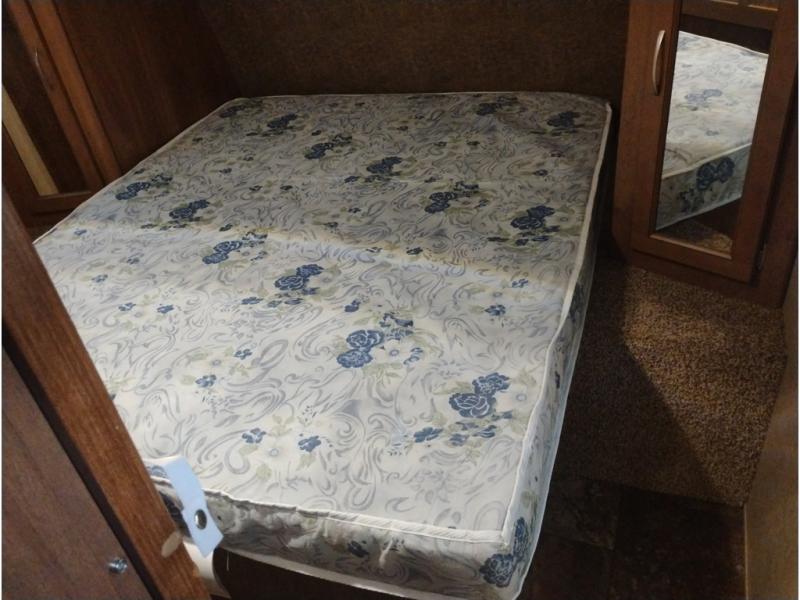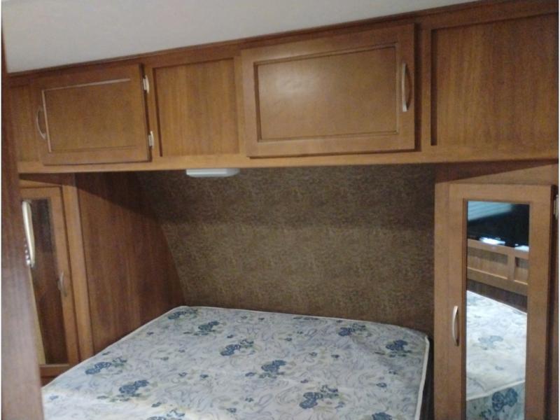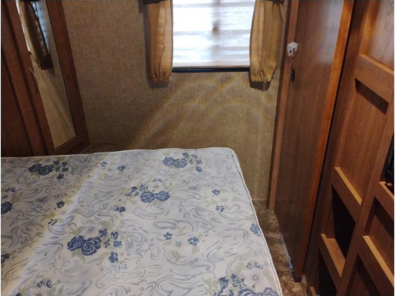 Step inside the entry door furthest to the front and see a bedroom to the right featuring a queen size bed, wardrobes on both sides, and overhead storage also.