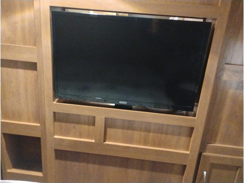 The entertainment center just outside the bedroom door along the interior wall can easily be viewed from any seating in the room.