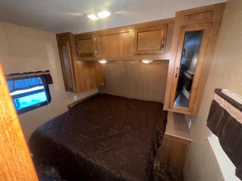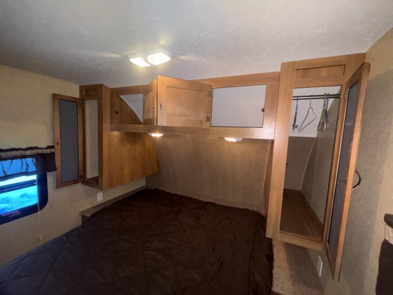 Before stepping inside check out the optional pull-out camp kitchen which would be located beneath the bunks. The kitchen provides a refrigerator, Coleman cooking grill, and single sink. There is also a front pass-through storage compartment that you can access from either side in front. The perfect place to stow away all of your outdoor gear, and things like fishing poles, golf clubs, and more.