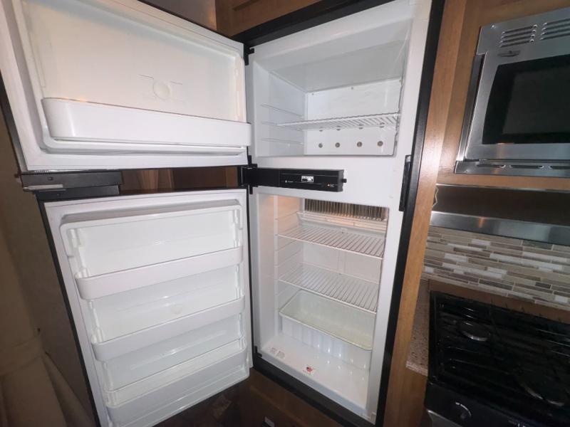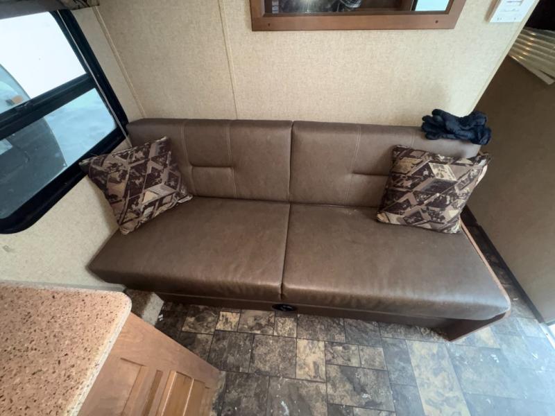 In the living area there is a sofa that runs width wise along the stub wall for added seating, plus there is a booth dinette for mealtime, or just hanging out. A TV entertainment center above the dinette along the rear exterior bath wall can easily be viewed from the dinette or sofa.