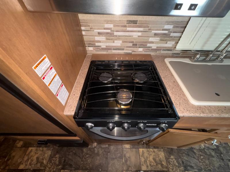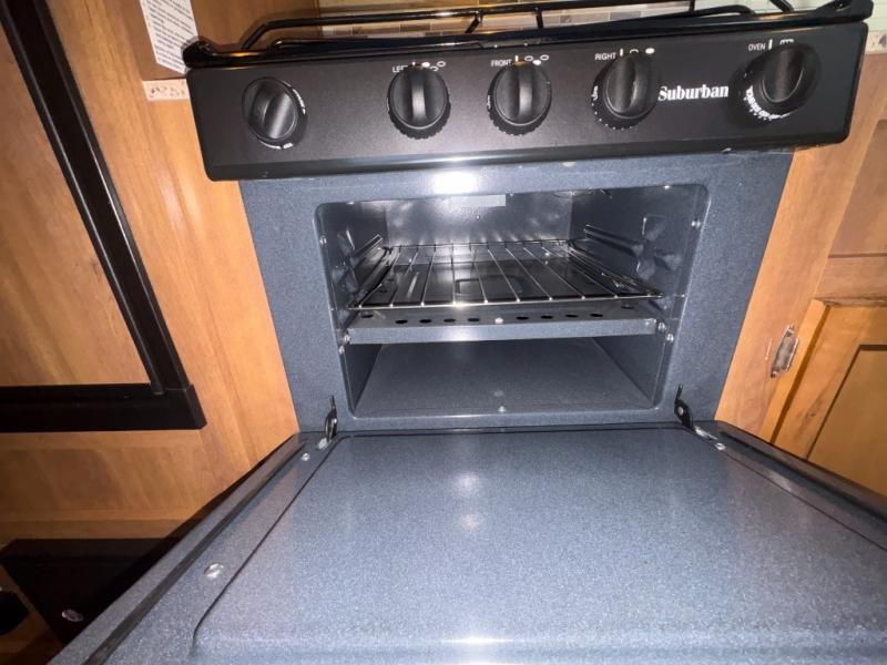 The kitchen provides all the things you need to be able to cook and prepare food for your family. There is a refrigerator, three burner range, microwave oven, and large single sink. There is also overhead storage too.