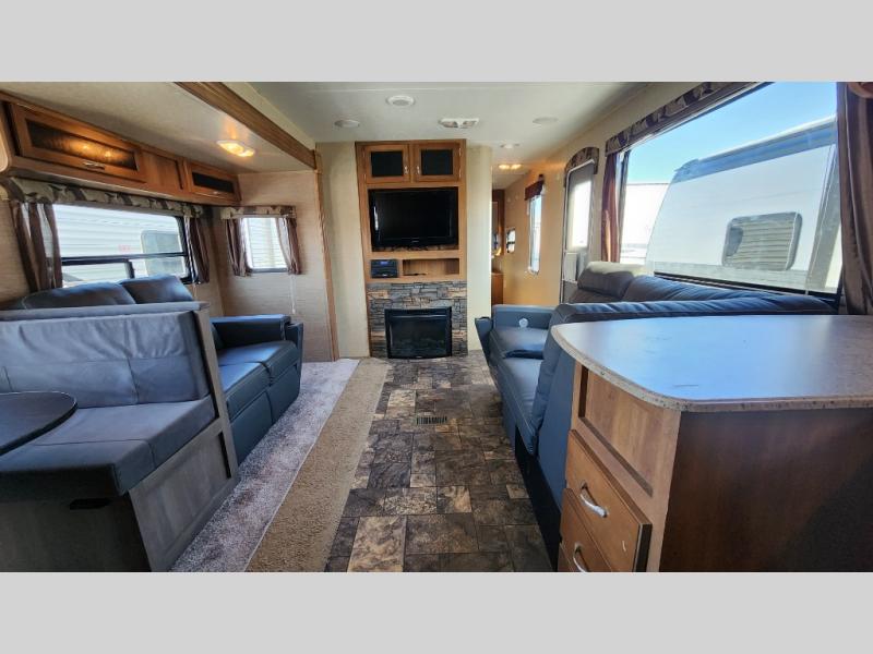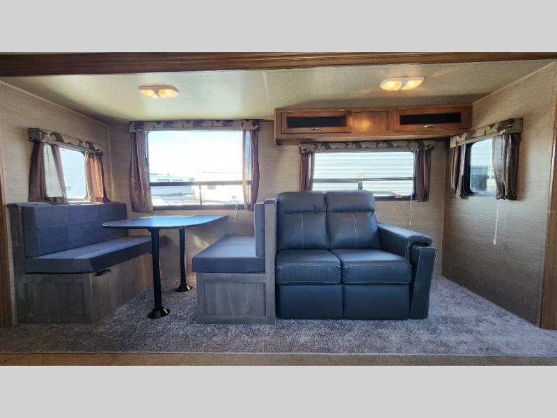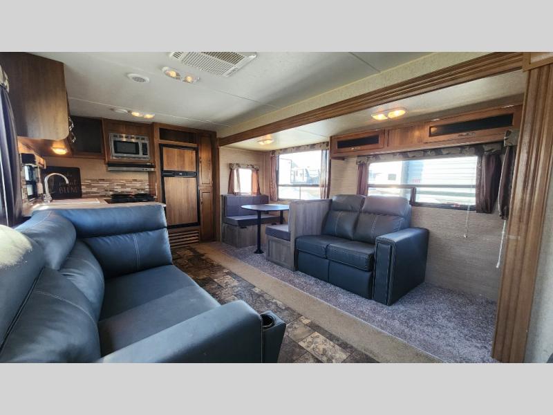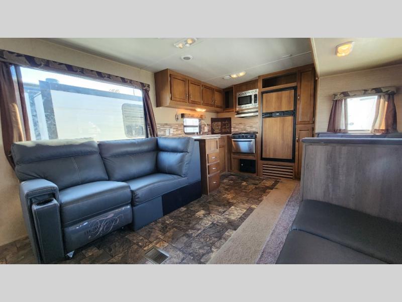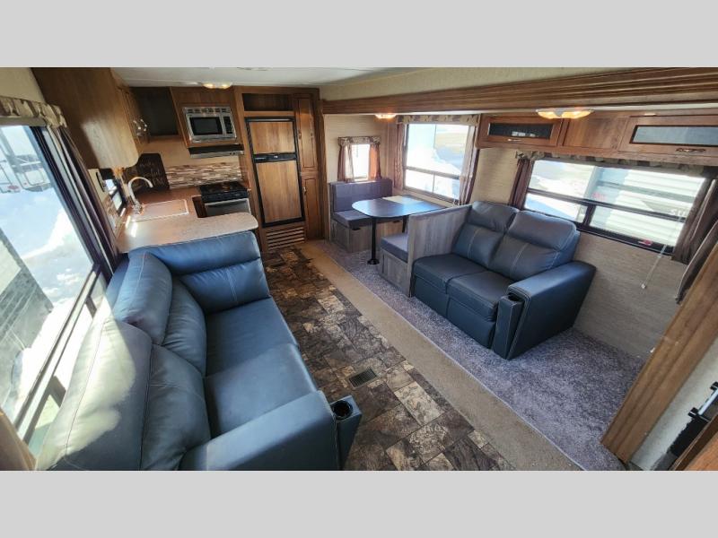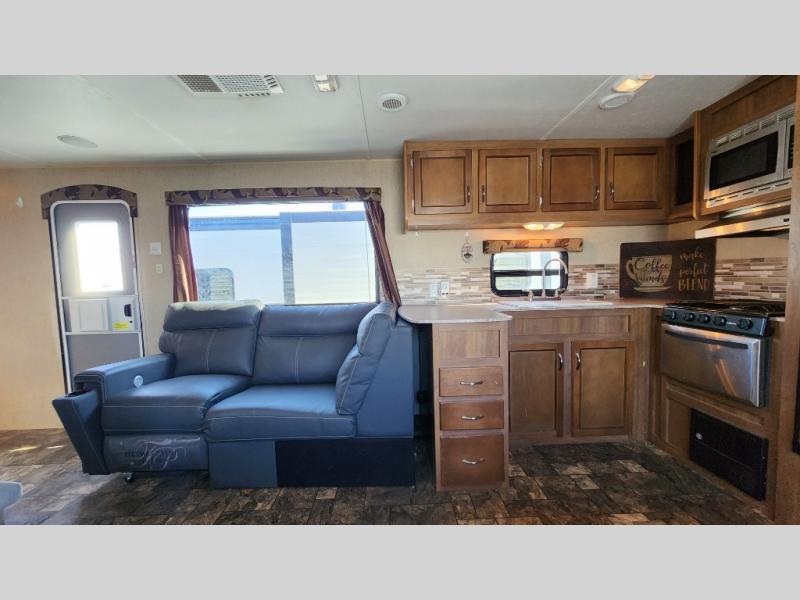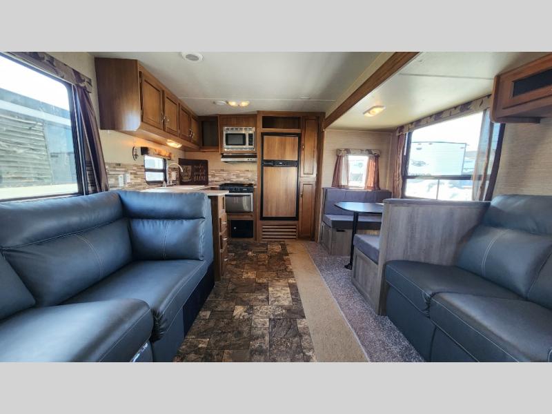 Step inside and enjoy the open concept feel created with the large slide out sofa and booth dinette. You can also choose the optional free standing dinette if you like. To the left of the door there are two lounge chairs, and the kitchen continues and wraps around the back providing everything you need to prepare and cook food.