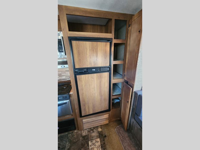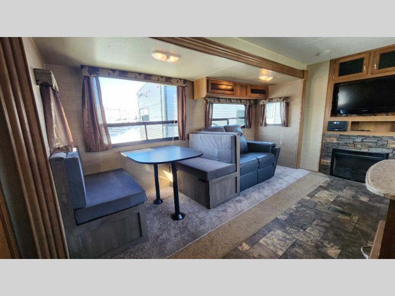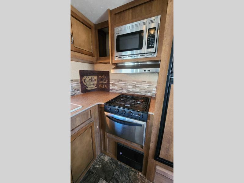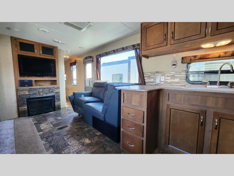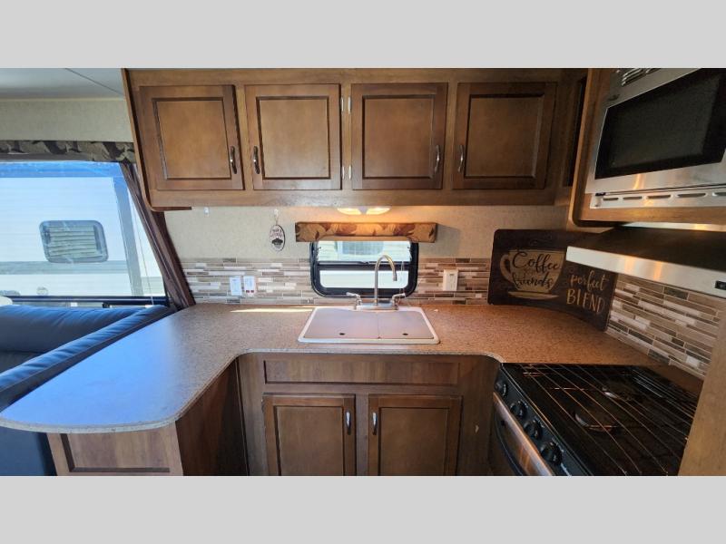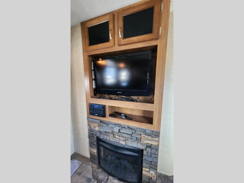 The rear kitchen is a notable feature of this Coachmen Catalina 293RKS travel trailer. There is also a large slide out for added space, plus you will enjoy the electric fireplace at the base of the TV entertainment center too!