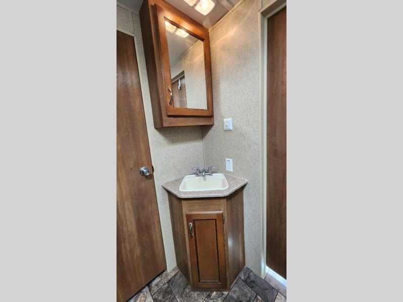 Head right just inside the door to a hall that leads to the front private bedroom. Just before the bedroom you will find a side aisle bath on the left. Inside find a angled shower with glass door, linen cabinet, toilet, and corner sink with medicine cabinet above. The bath offers a second door that slides and leads directly into the front bedroom for added convenience.