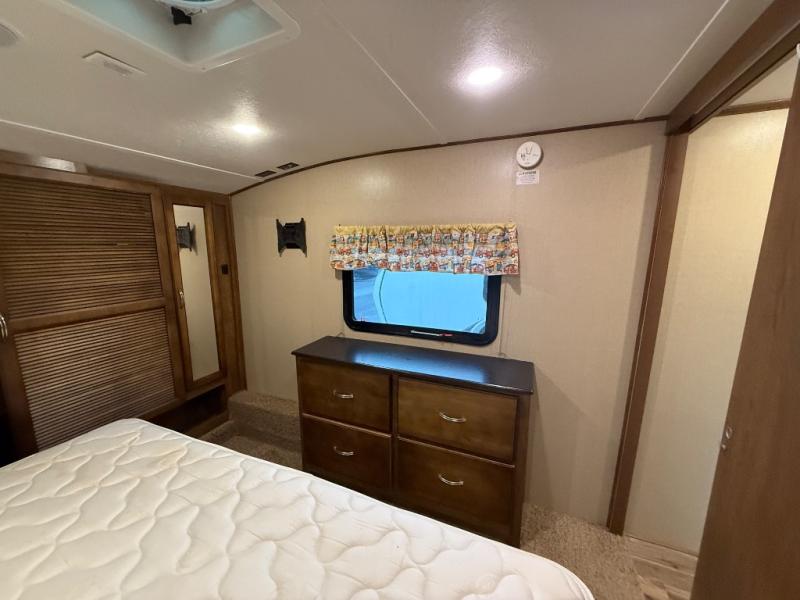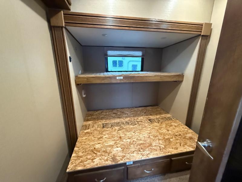 Step inside and head straight across the hall to the center bedroom that features a slide out queen bed with bunk above. There is also a wardrobe with drawers, and a corner overhead TV cabinet.