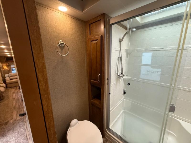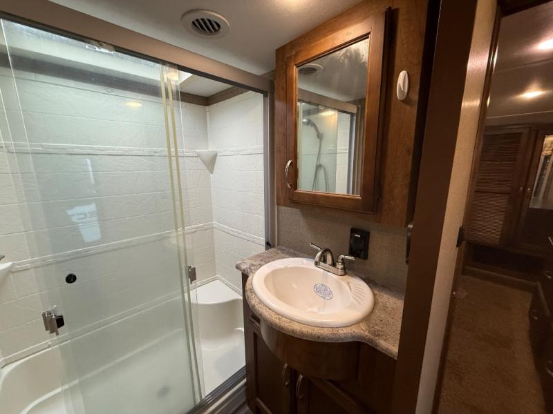 Head up the steps to the right of the entrance and find a side aisle bath on your left which includes a 50" x 30" shower, linen cabinet, toilet, and sink with overhead storage.