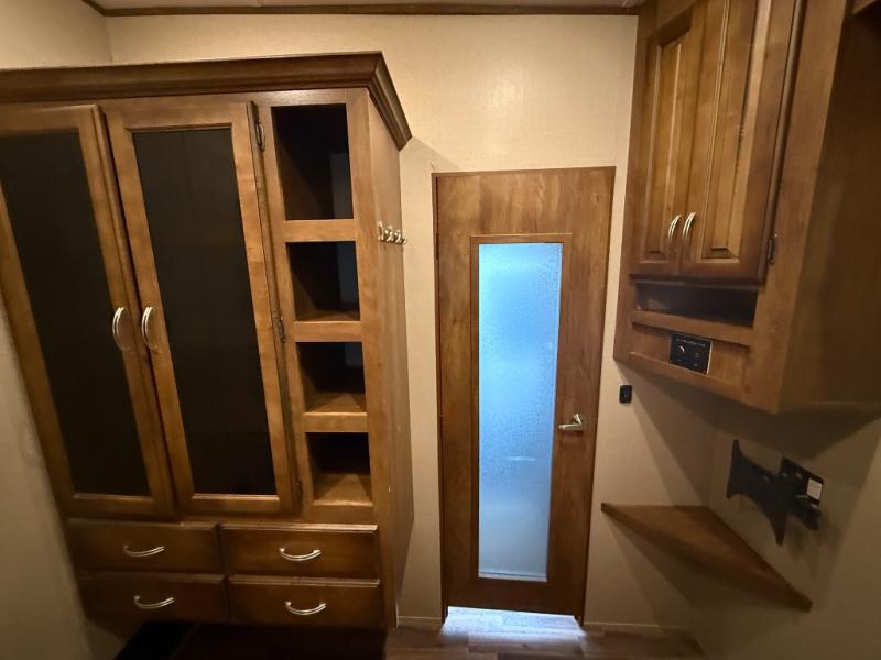 Continued forward down the hall to a private master bedroom with sliding door. Inside enjoy sleeping on the queen or optional king bed slide out with dresser opposite found along the curb side wall. There is also a TV bracket so you can easily add one for viewing if you choose. The front wall is filled with wardrobe storage for your things and a washer/dryer prepped space is in the center in case you wish to add units for even more convenience as you travel.