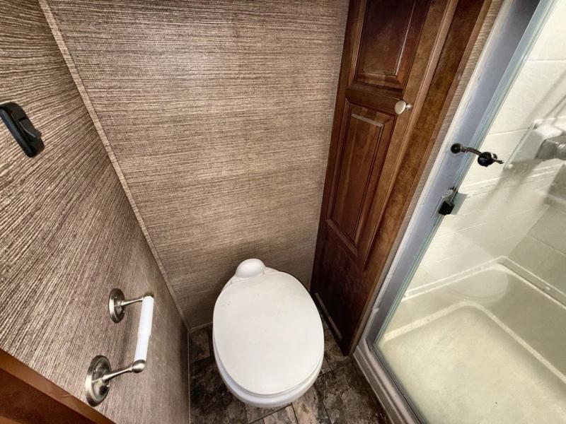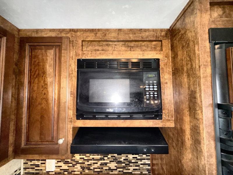 Enter and find yourself in the living room area with two swivel rockers immediately to your left with overhead cabinets above for storage. There is an entertainment center and wardrobe straight ahead along the interior living room wall also. A slide-out sofa and booth dinette opposite the door creates a more open walkway throughout the space. There are overhead cabinets above the sofa for added use.