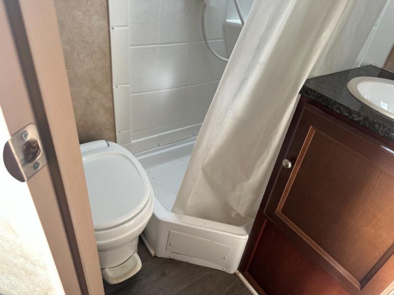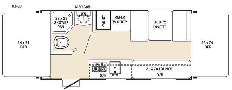 Step inside and see how much space you will have to enjoy with the rear expanding bed that is 54" x 74". Straight ahead is a convenient bath which includes a 27" x 27" shower pan, a toilet, and a vanity with sink, plus overhead medicine cabinet.
