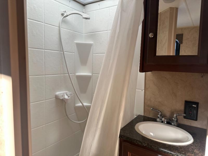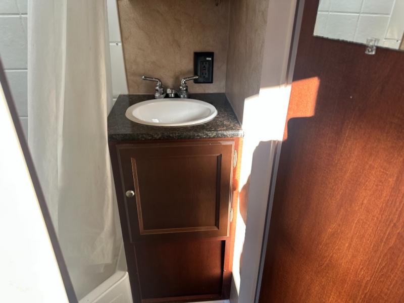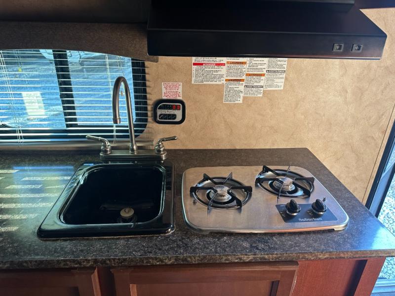 There is a kitchenette to your right as you enter featuring a two burner cook-top, single sink, and storage overhead. A food pantry can be found opposite along side of the 2-way refrigerator with TV counter-top above.