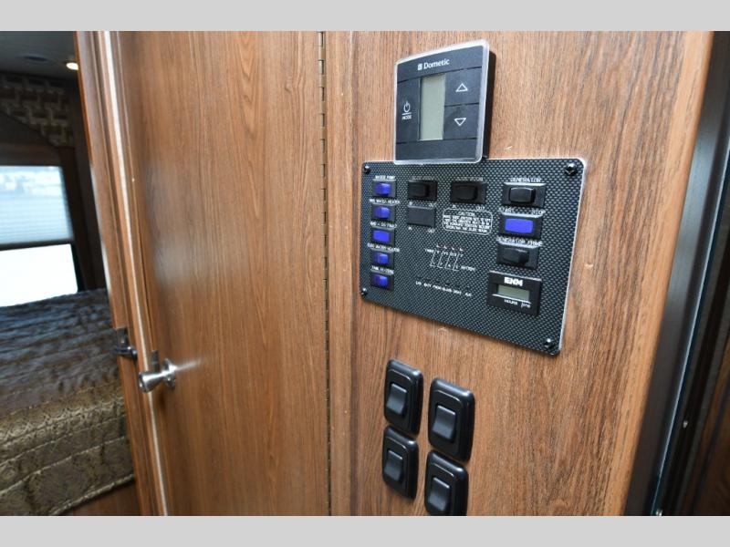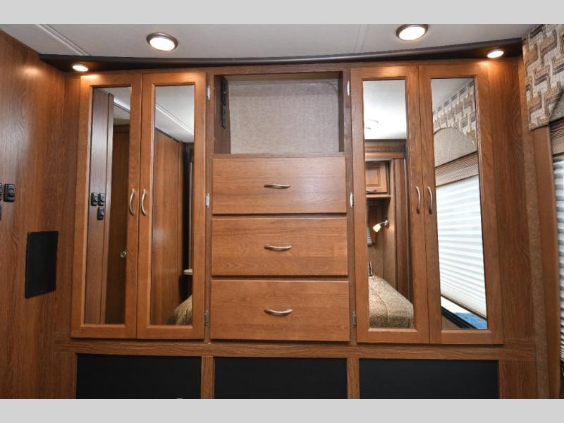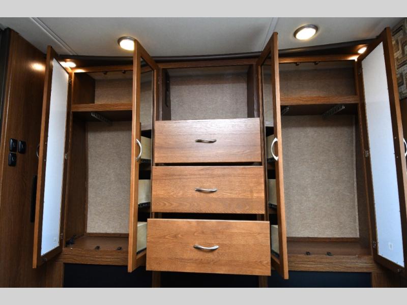 Private Rear Bedroom: Queen bed with overhead cabinets and wardrobe storage