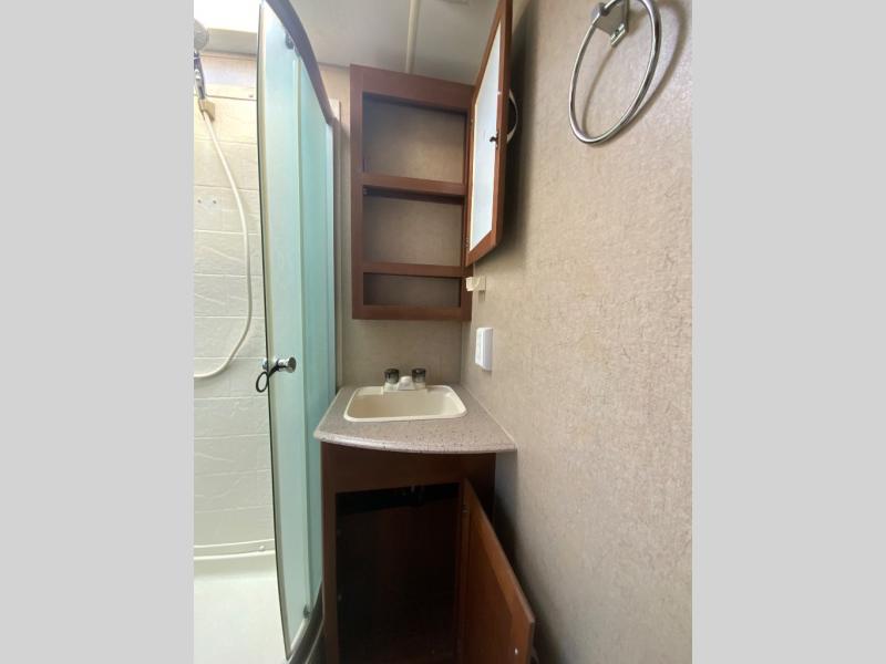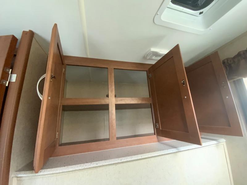 The front exterior pass-through storage compartment features plenty of space for all of your outdoor camping gear. And a rear camp kitchen below the bath linen cabinet is a great feature for those who enjoy cooking and dining outside.