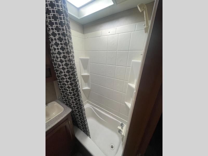 In the main living area there is a large slide out u-shaped dinette and sofa with overhead storage cabinets. A pantry for storage outside the bunk area located across from a bath which includes a toilet, sink and tub/shower.