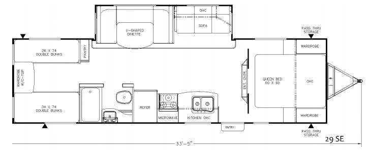 Step inside model 29SE and find a front bedroom with queen size bed and dual bedside wardrobes. There is also an overhead cabinet for more storage. The entertainment center just inside the door has sliding doors on either side that allow you access into the front bedroom.