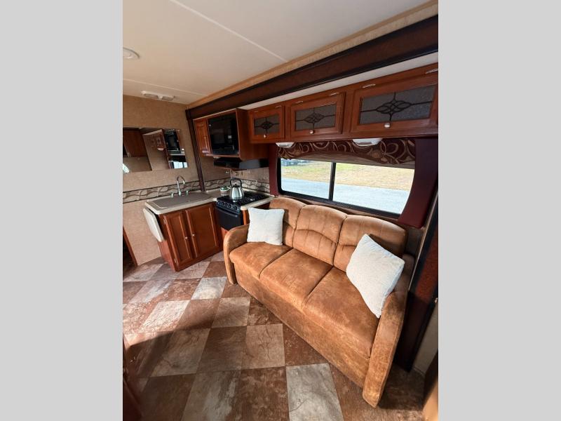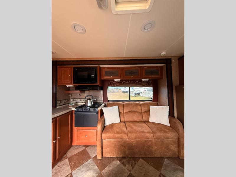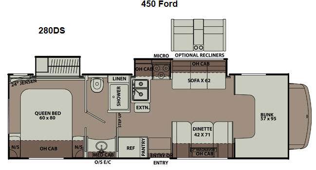 As you enter model 280DS notice the slide out kitchen area and 62" sofa along the opposite side. The kitchen includes a double sink and counter extension along the interior wall. Overhead cabinetry, a three burner range with microwave oven, plus a 62" sofa all slide out to provide added interior space to move about. There is a booth dinette along the opposite side which features overhead cabinetry with an optional pull down 32" Magnavox TV. There is also a pantry and refrigerator to the left of the steps as you enter.