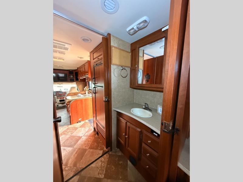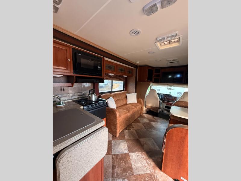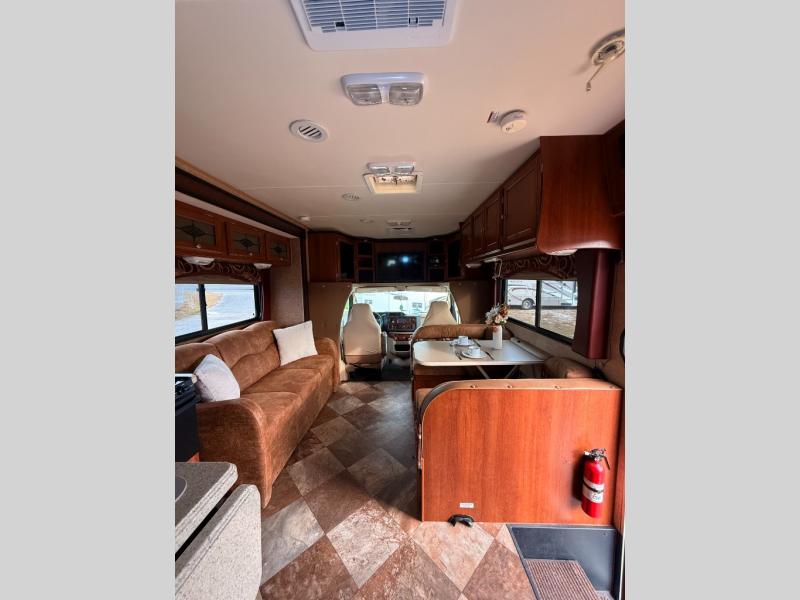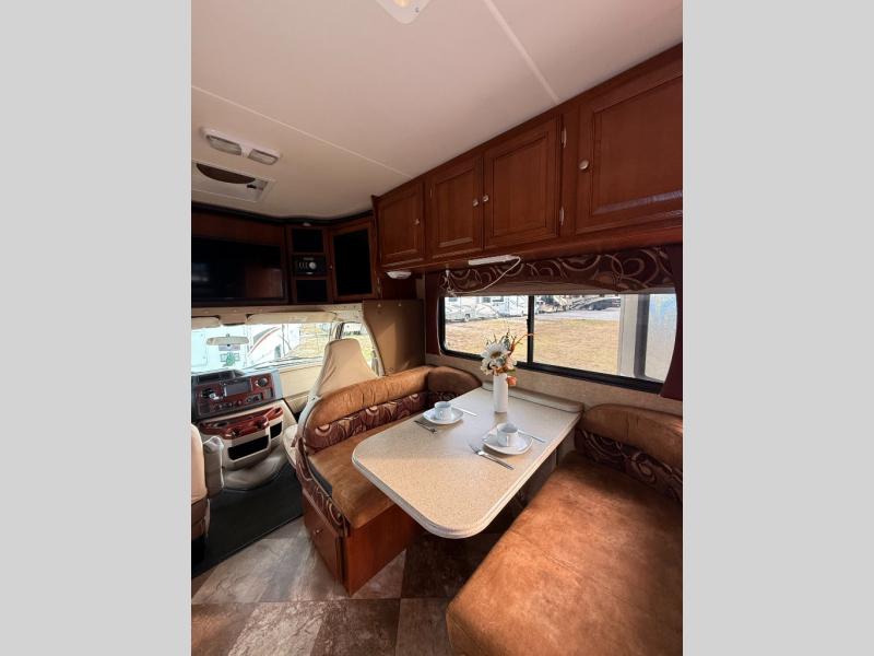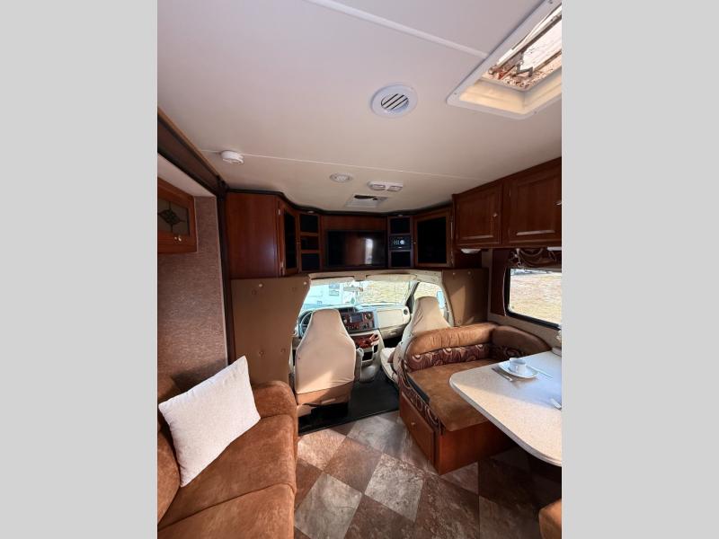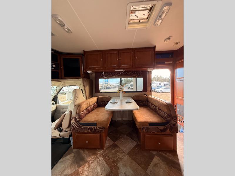 Dual slides are the reason for this Coachmen Leprechaun's spacious interior. This class C coach features a combined kitchen and living area up front, and a step up walk-thru bath and bedroom including a second slide for added space in the rear.