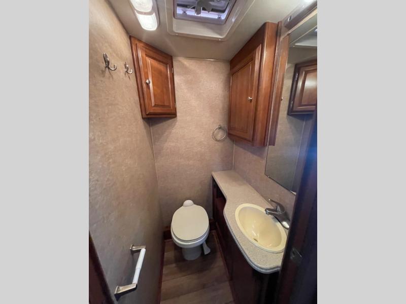 Head into the rear private bedroom and bath area combined. The shower is to the left as you enter, and a private toilet area with vanity and sink is on your right. The queen bed features a shirt closet and nightstand on one side and wardrobe for additional storage on the opposite side. There is also a slide out wardrobe, plus so much more!