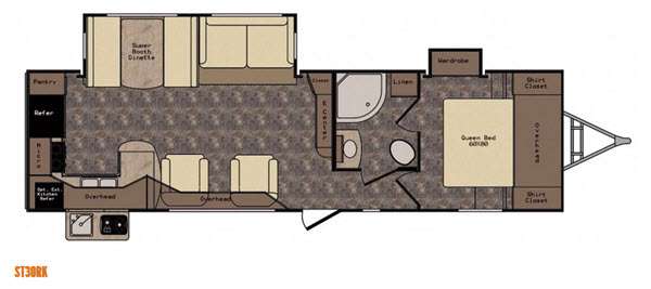 The Sunset Trail Reserve ST30RK travel trailer by CrossRoads RV offers double slides and a rear kitchen.