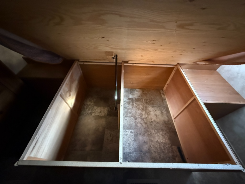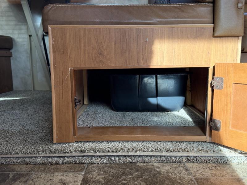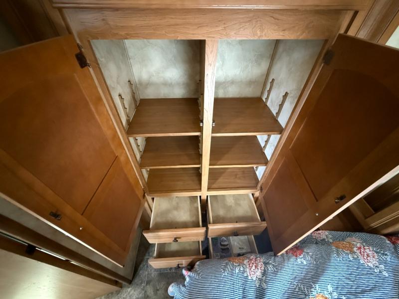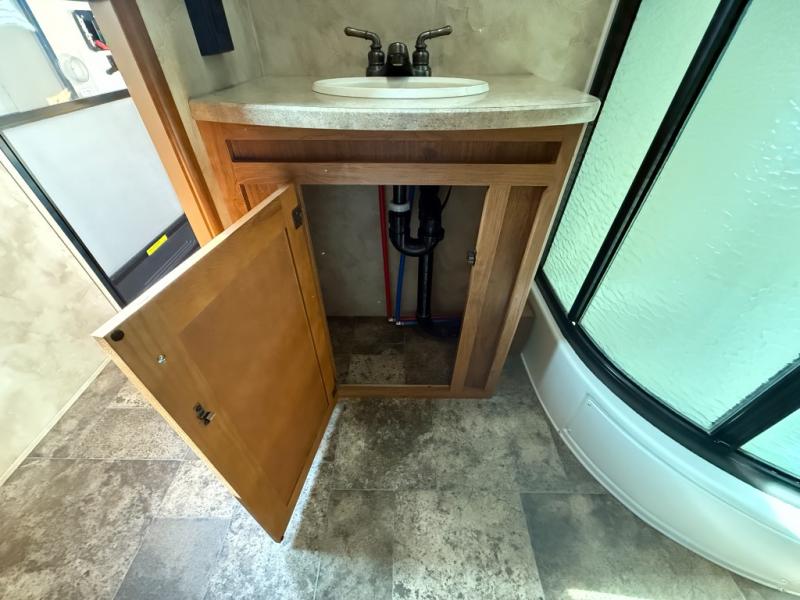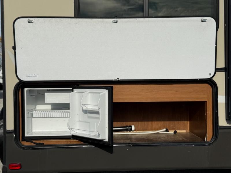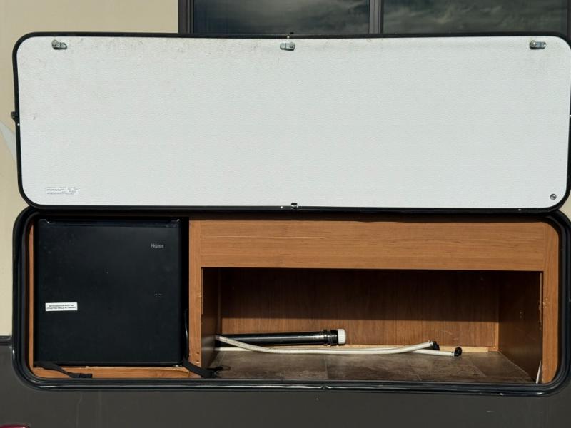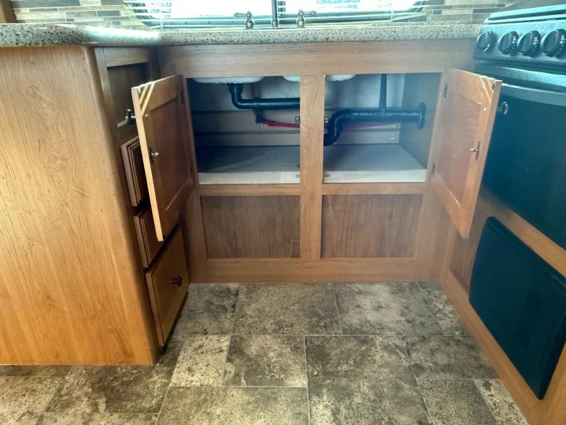 You will find plenty of overhead cabinets throughout the travel trailer as well as a pass thru storage area. Outside you can even enjoy the optional exterior kitchen which offers a refrigerator, sink, two burner range.