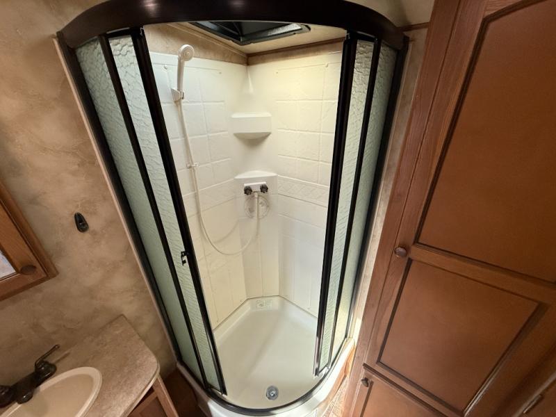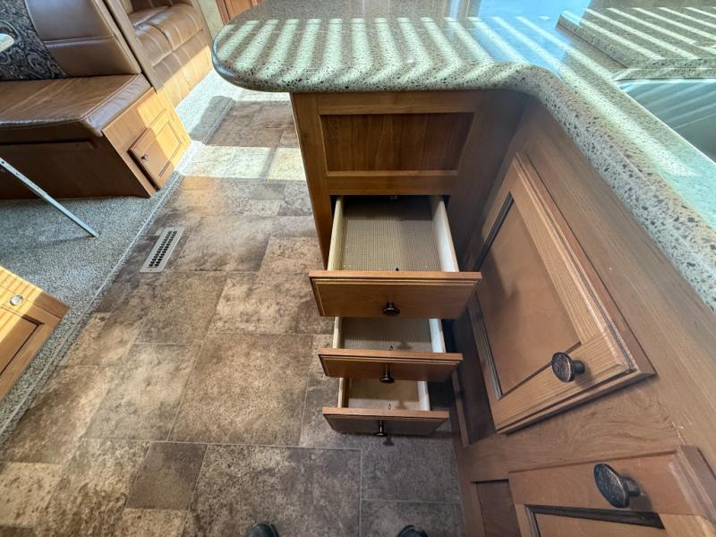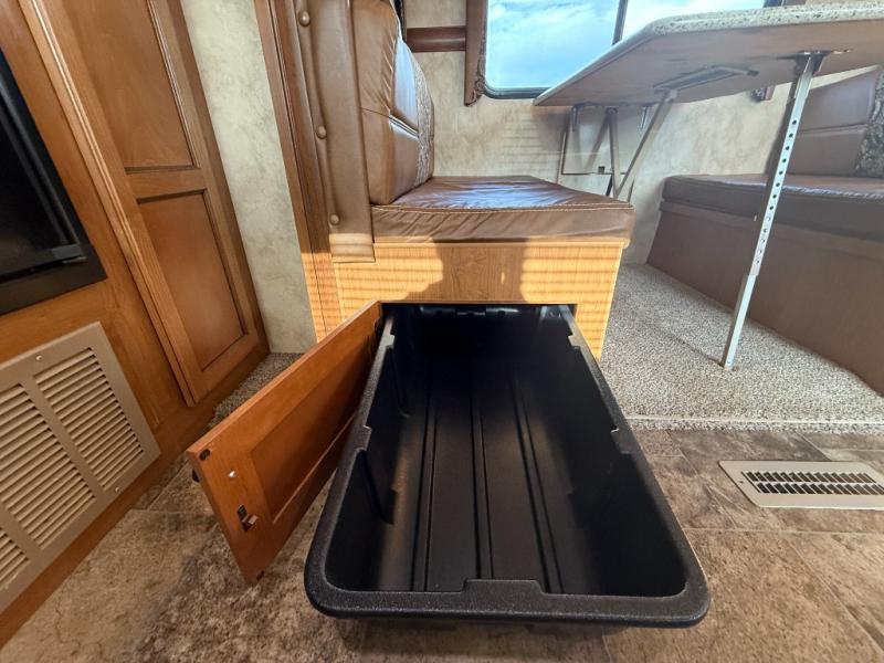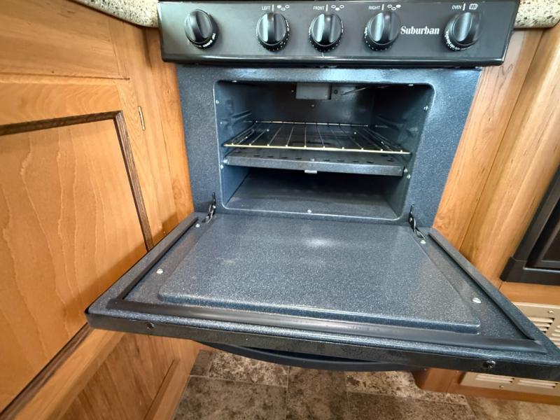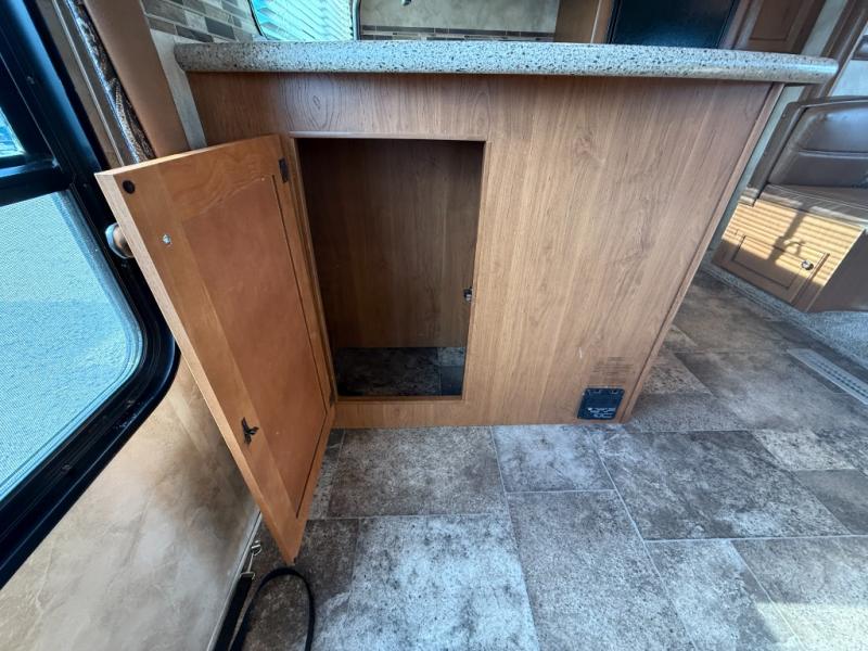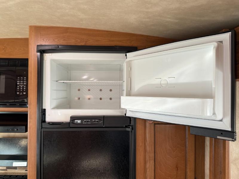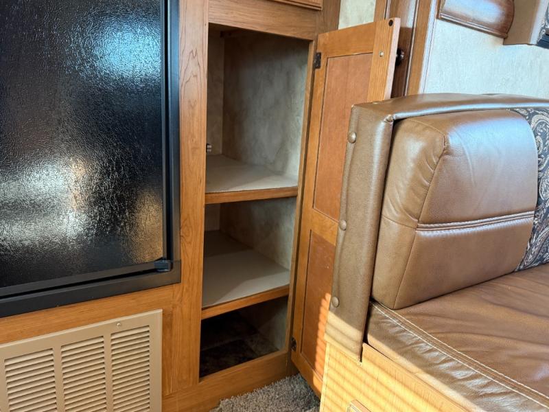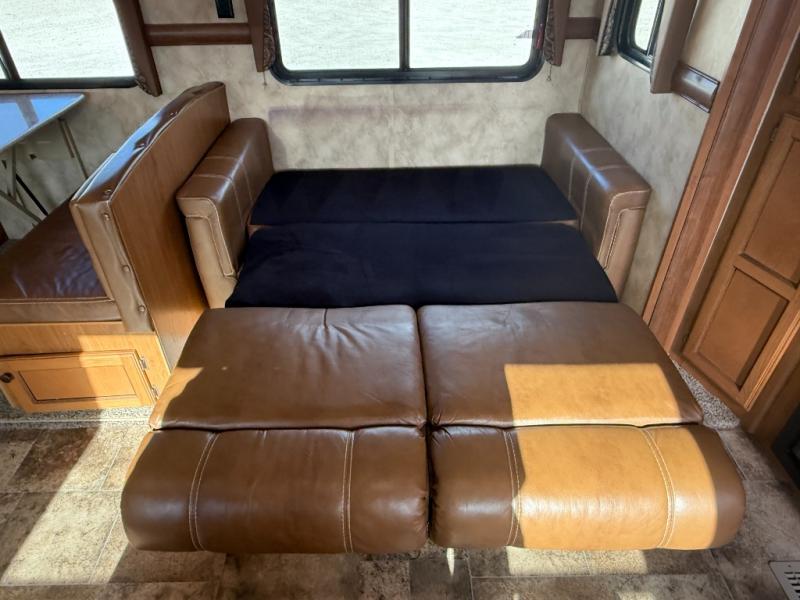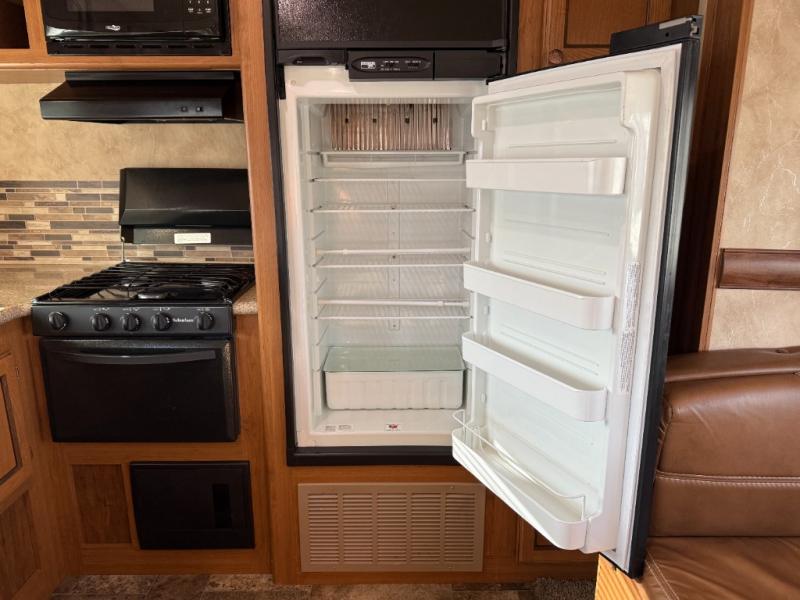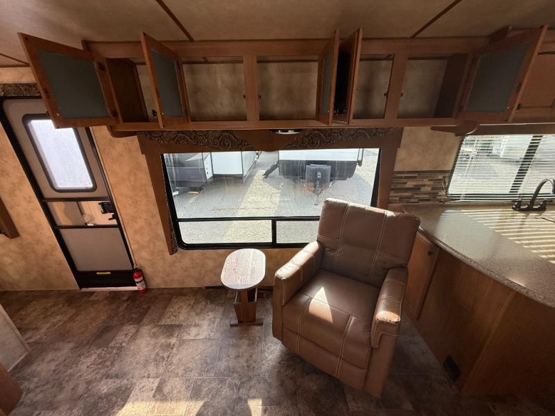 As you enter the travel trailer, to the left there are two lounge chairs. The kitchen area offers a double kitchen sink, extra counter space, a range, microwave, refrigerator, and pantry. The slide has a super booth dinette and a sofa. Next to the sofa you will find a closet and an entertainment center.