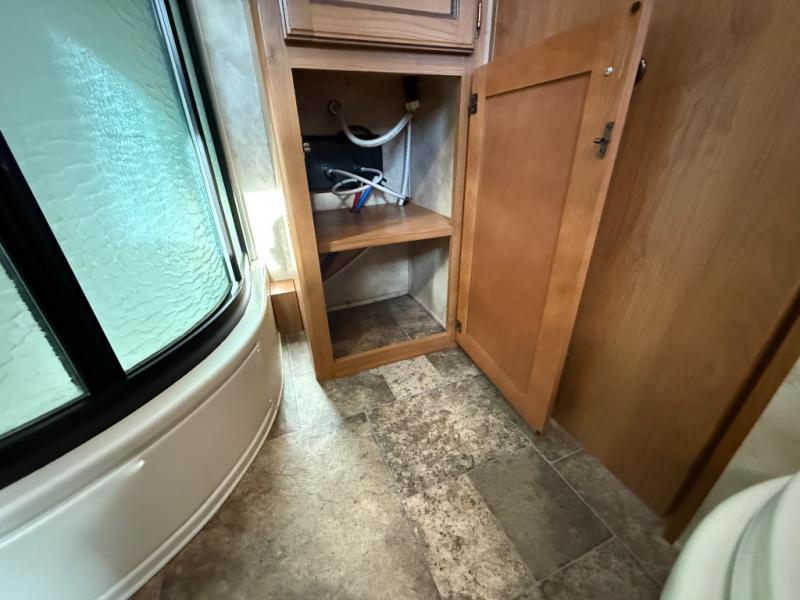 The side aisle bath offers a sink, medicine cabinet, shower, linen cabinet, and toilet.