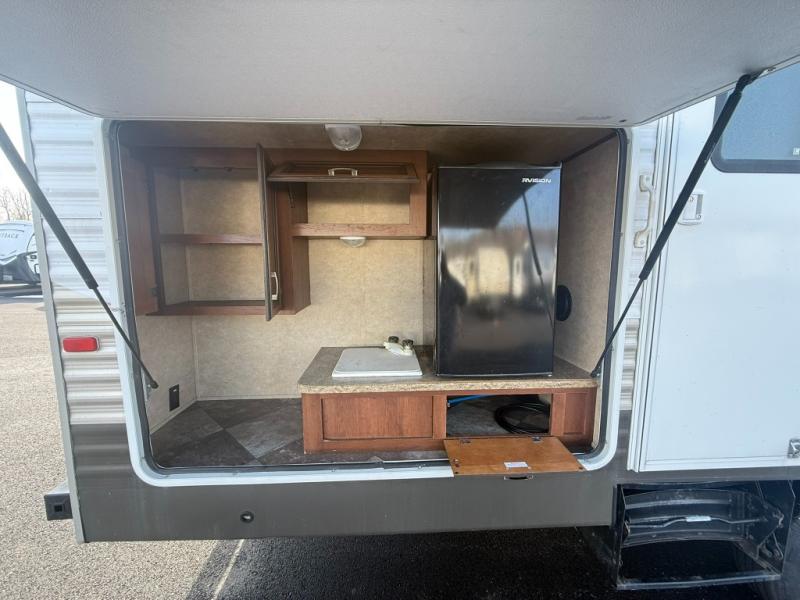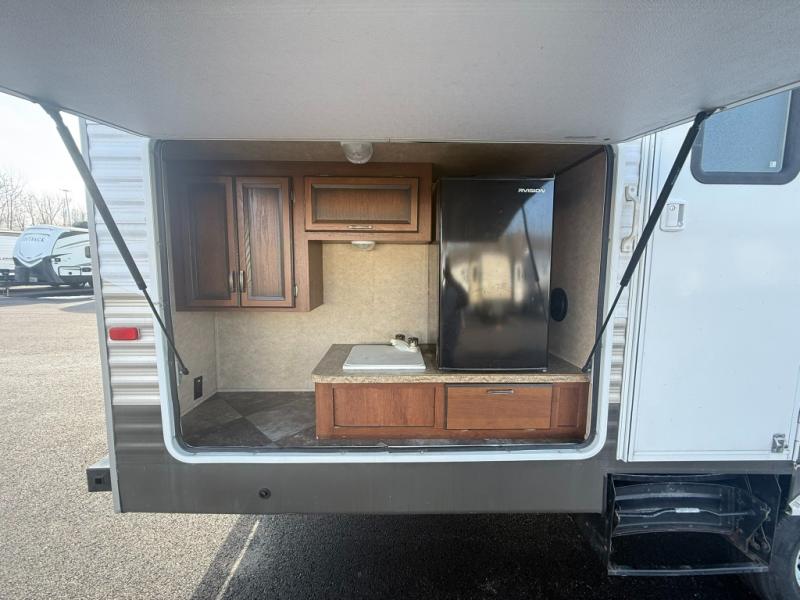 You will find plenty of overhead cabinets throughout the travel trailer. Outside you are sure to enjoy the exterior kitchen which has a sink, refrigerator, and overhead cabinet.
