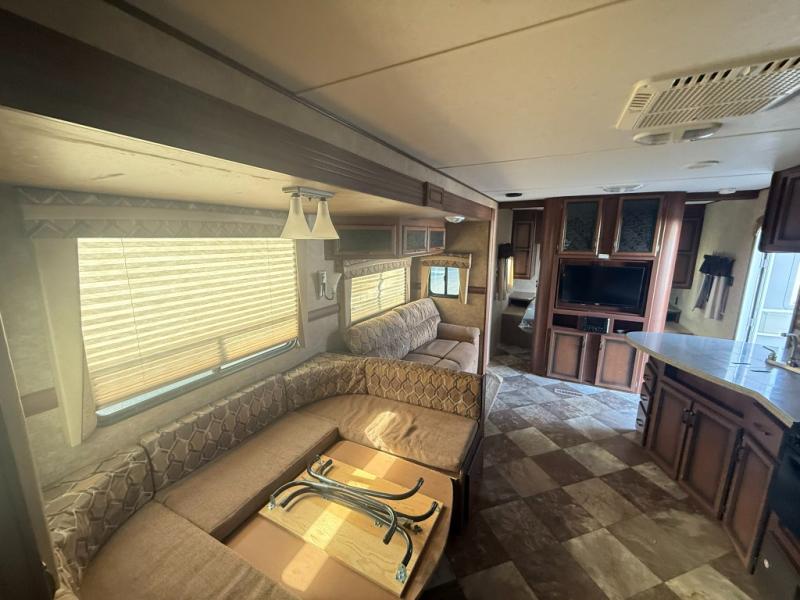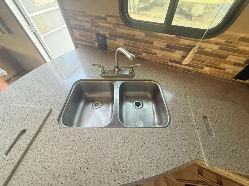 Stepping inside the travel trailer, to the left is a double kitchen sink, three burner range, microwave, and refrigerator. The opposite side of the travel trailer has a slide with a sofa and u-dinette. Next to the dinette is a large pantry. In the front of the living area you will find an entertainment center.