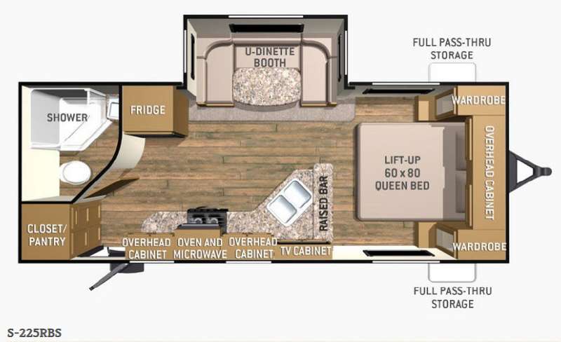 Enjoy camping in this Shadow Cruiser model S-225RBS by Cruiser RV. It features a convenient rear bath, and u-shaped dinette slide for added interior space and seating.