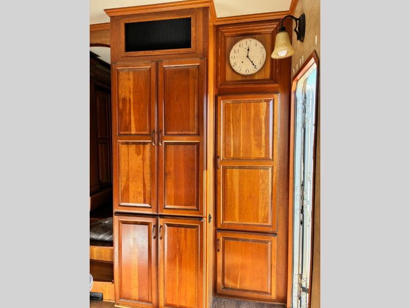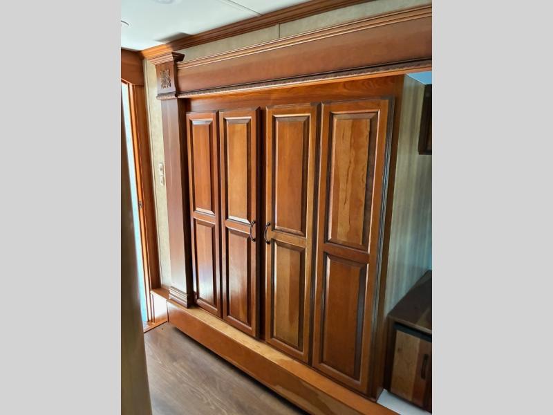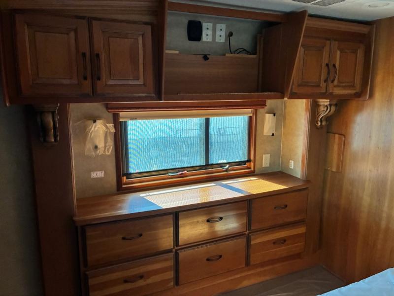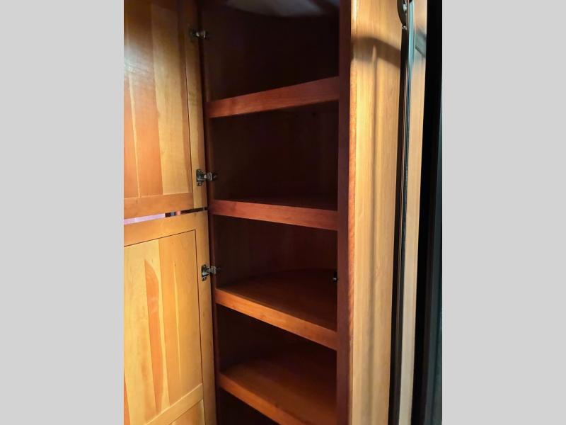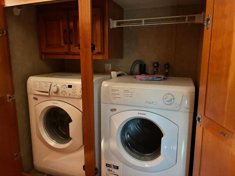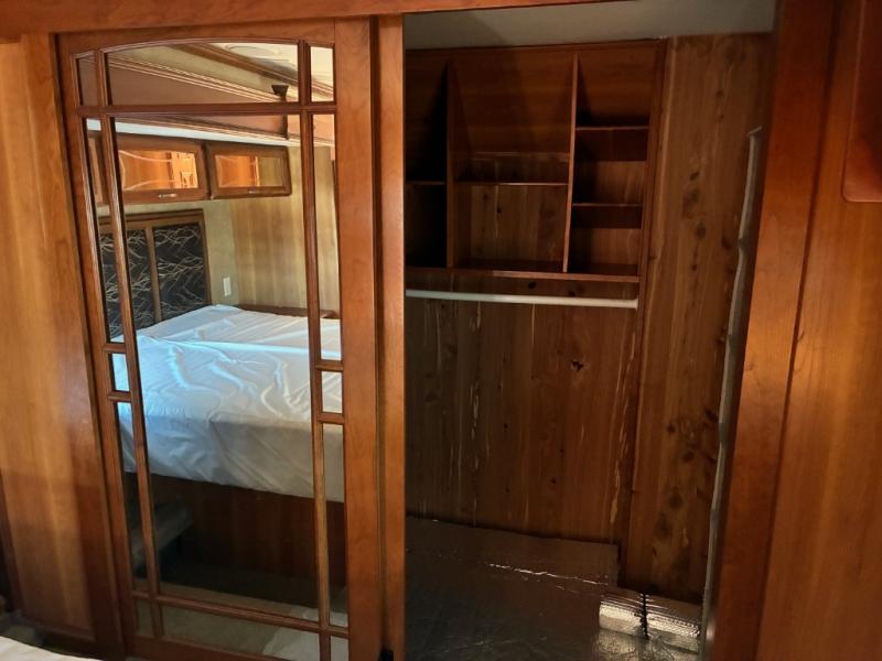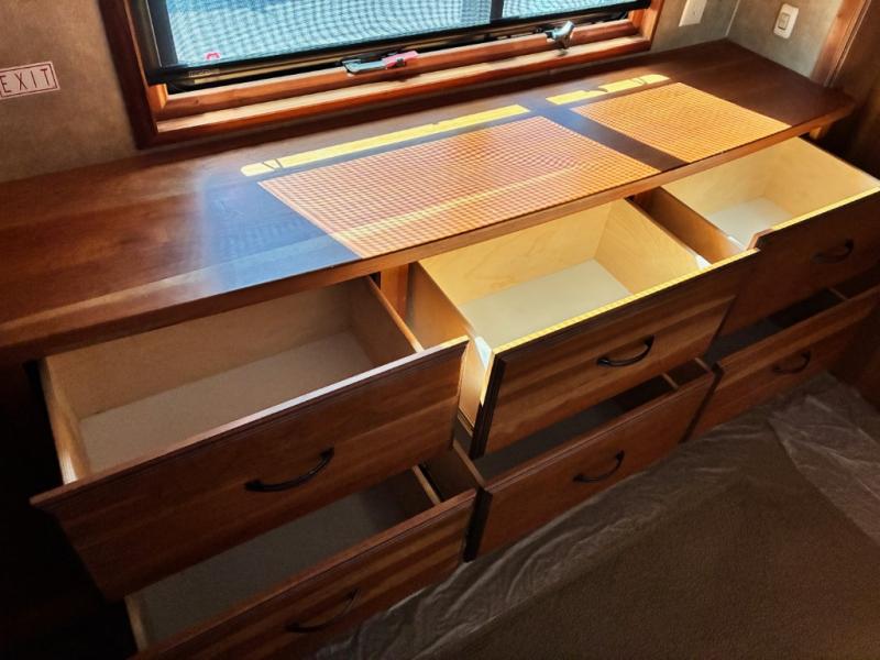 Directly across from the bathroom there is a slide out wardrobe that has a washer and dryer, along with a nightstand and queen size bed with storage space above for your things. There is a vanity with drawer space opposite the bed along with a place to add a TV. The cedar lined walk-in closet has tons of space for your things. There is a built-in dresser on one end and shelving on the opposite end, plus plenty of space for hanging your clothes, and so much more!