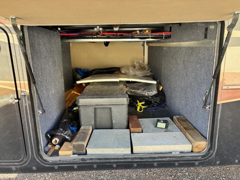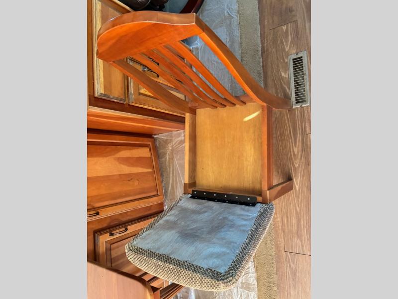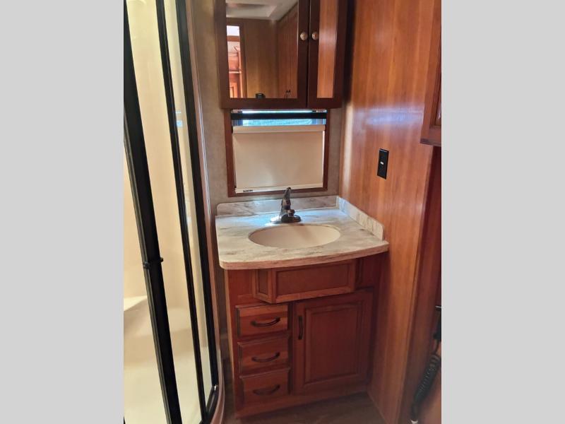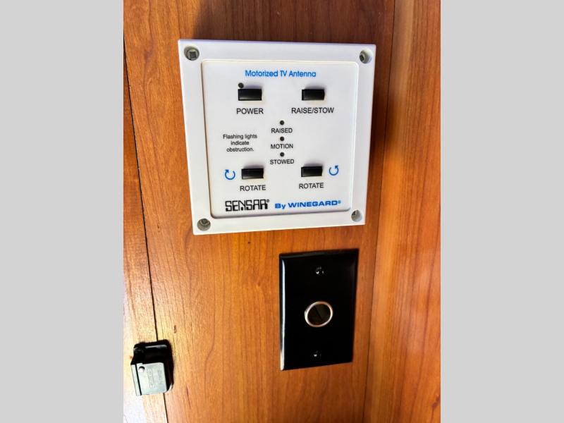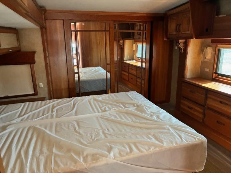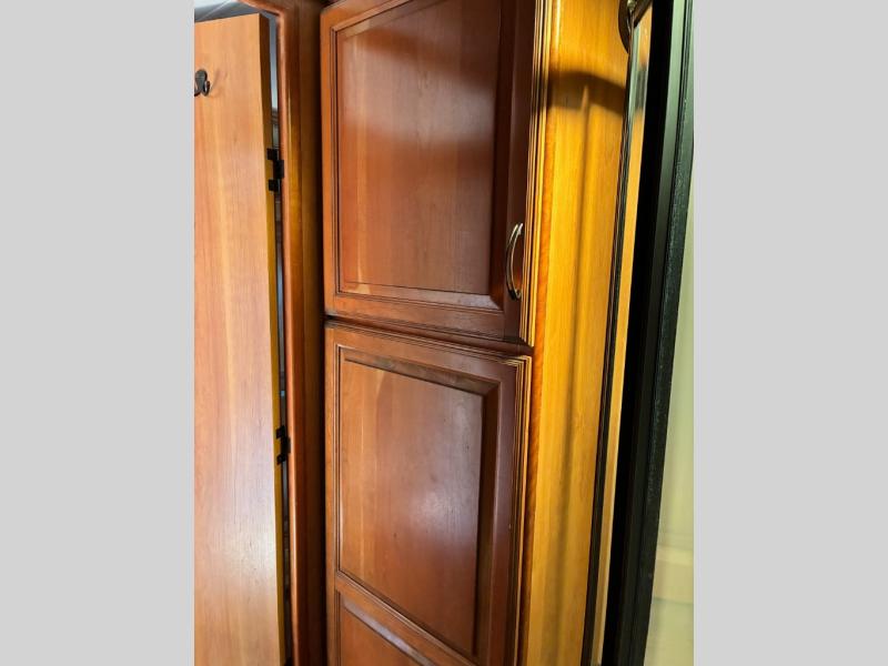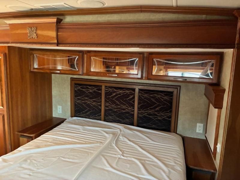 Directly across from the bathroom there is a slide out wardrobe that has a washer and dryer, along with a nightstand and queen size bed with storage space above for your things. There is a vanity with drawer space opposite the bed along with a place to add a TV. The cedar lined walk-in closet has tons of space for your things. There is a built-in dresser on one end and shelving on the opposite end, plus plenty of space for hanging your clothes, and so much more!
