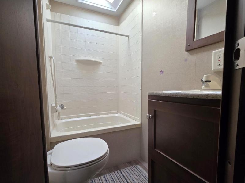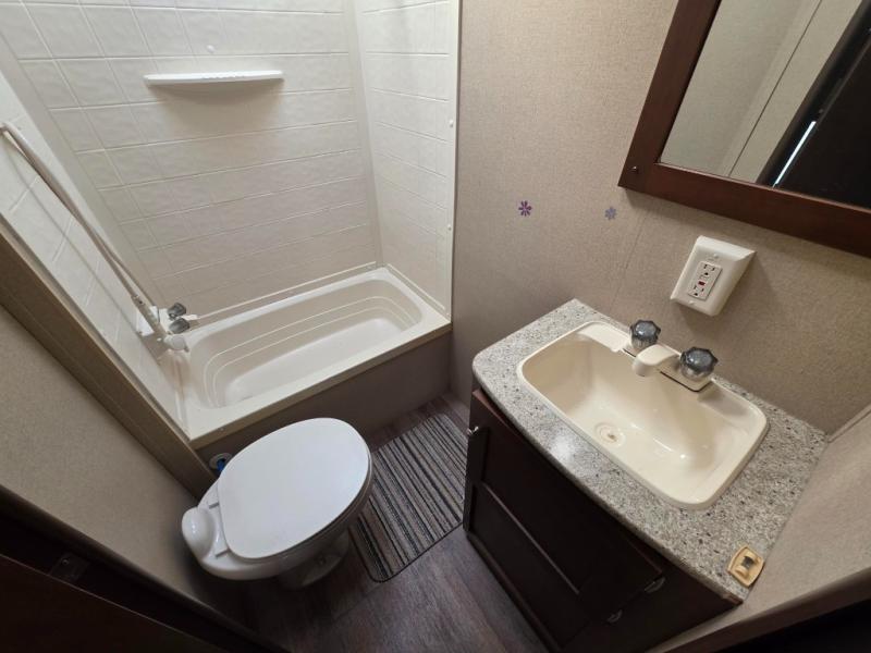 In the rear of this unit you will find a corner bath with toilet, sink, and tub.