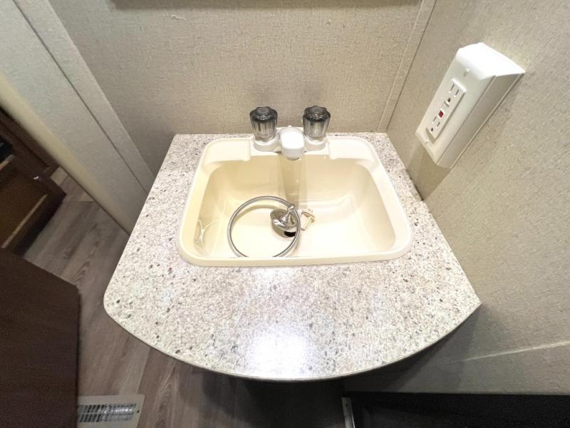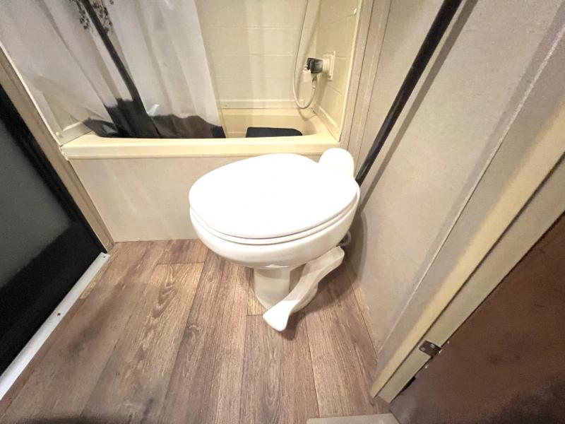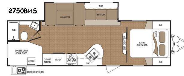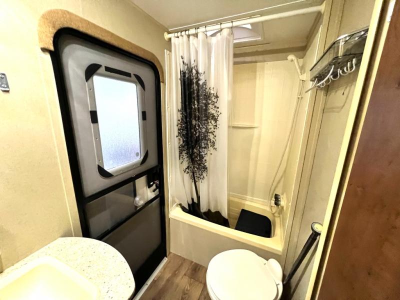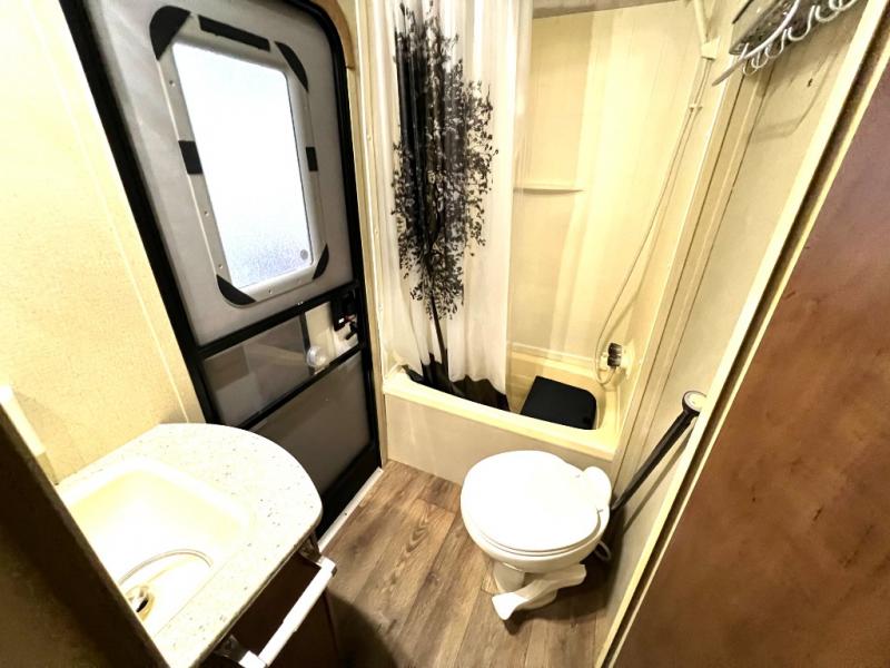 Across the rear of this Aspen Trail you will find a convenient bath including a tub/shower, toilet, and vanity with sink. The opposite corner features a double bed set of bunks.