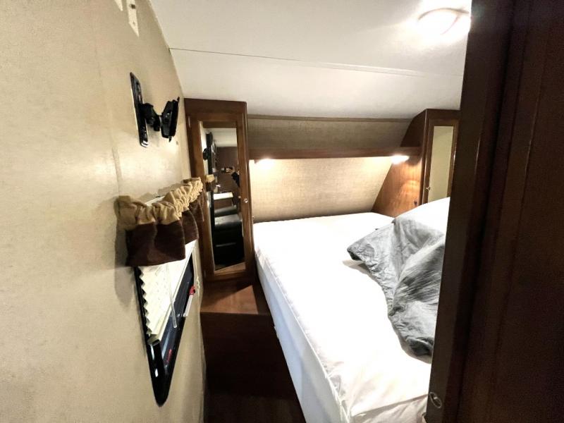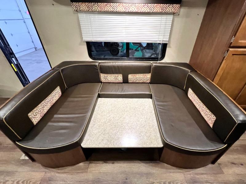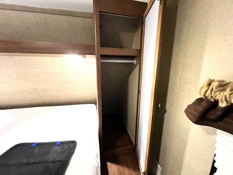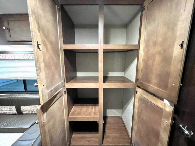 Step inside and enjoy a wide open space thanks to the large slide out sofa and u-shaped dinette opposite the door. There is an entertainment center just to the right in the center of the floor that can easily be viewed throughout the space. On either side of it you will find sliding doors allowing access into the front master bedroom. Here you will enjoy a queen bed, dual shirt closets, and an overhead shelf for added storage.
