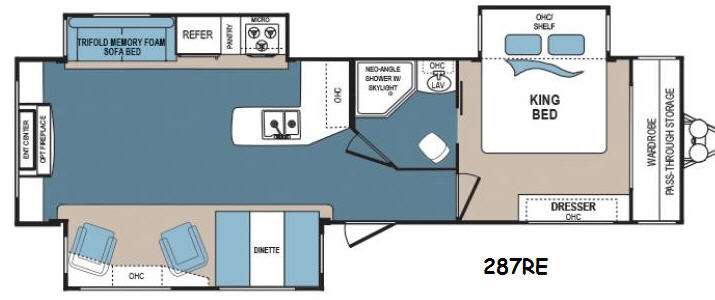 The front bedroom features a king size bed slide with overhead shelf for storage. There is a dresser with overhead cabinet opposite the bed, and a full front wall wardrobe with pass-through storage below.