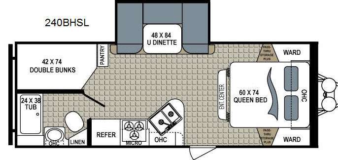 The kitchen features a refrigerator, three burner range, microwave oven, and double sink. A small pantry can be found at the foot of the bunk beds near the u-shaped dinette slide.